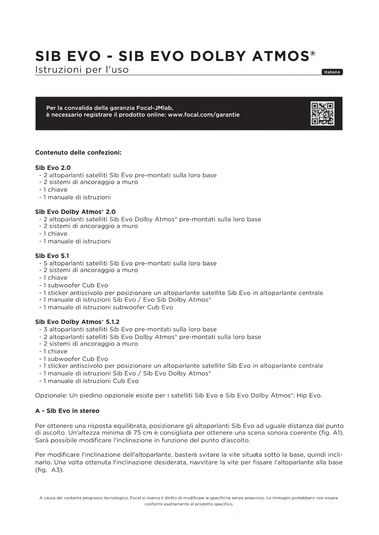 sotto la rotula con la chiave fornita (fig. D5). E - Cablaggio Collegare gli altoparlanti Sib all'amplificatore con un cavo di alta qualità Hi-Fi, tra 0,75 e 2 mm² di cui uno dei conduttori è contraddistinto da segno visivo. Rispettare la messa in fase collegando i terminali indicati "+" dell'amplificatore al terminale "+" dell' altoparlante corrispondente. Procedere quindi allo stesso modo per i terminali indicati "-" (fig. E1). Per il satellite Sib Evo Dolby Atmos®, assicurarsi di rispettare i connettori indicati sul retro del satellite, l'altoparlante frontale corrispondente al connettore sul fondo e l'altoparlante del soffitto Dolby Atmos® corrispondente al connettore superiore (fig. E2, E3). Notice_SibEvo_SibEvo DolbyAtmos.indd 22 21/02/17 12:0623 SIB EVO - SIB EVO DOLBY ATMOS® Istruzioni per l’uso F - Impostazioni audio/video dell'amplificatore: Si consiglia di impostare i vostri altoparlanti Sib in modalità "SMALL" nel menù del vostro amplificatore audio/video. Raccomandazione: ● Nel caso in cui l'amplificatore abbia una funzione di calibrazione automatica, assicurarsi che il vostro amplificatore abbia l'ultimo firmware disponibile. ● Nel caso in cui abbiate bisogno di effettuare delle impostazioni manualmente, è consigliabile: - impostare la frequenza di taglio a 80 Hz. - raddoppiare la distanza degli altoparlanti Atmos® rispetto agli altoparlanti frontali. - aumentare il livello sonoro fino a ottenere un risultato soddisfacente. G - Subwoofer Per la riproduzione delle basse frequenze, si consiglia il subwoofer Cub Evo. H - Periodo di rodaggio Gli altoparlanti utilizzati in Sib Evo utilizzano componenti meccanici complessi che richiedono un periodo di rodaggio per funzionare al meglio delle loro possibilità e per adattarsi a condizioni di temperatura e umidità dell'ambiente. Questo periodo varia a seconda delle condizioni incontrate e si potrà prolungare per qualche settimana. Per abbreviare questo periodo, si raccomanda di far funzionare l'impianto acustico venti ore circa a livello medio, riproducendo programmi musicali ricchi di bassi. Una volta che le caratteristiche dell' altoparlante saranno completamente stabilizzate, potrete godere appieno delle prestazioni dei vostri altoparlanti. I – Manutenzione La manutenzione degli altoparlanti Sib Evo si limita all'utilizzo di un tessuto in microfibra per lo spolvero. Se nell'altoparlante c'è una macchia, vi consigliamo di utilizzare unicamente un panno in microfibra umido. Non utilizzare mai solventi, detergenti, alcool o prodotti corrosivi, raschietti e utensili abrasivi per pulire la superficie dell'amplificatore. Si consiglia di pulirle delicatamente e di non premere fortemente. Notice_SibEvo_SibEvo DolbyAtmos.indd 23 21/02/17 12:06SIB EVO - SIB EVO DOLBY ATMOS® Manual de uso Para validación de la garantía Focal-JMlab, es necesario registrar el producto en línea: www.focal.com/garantie Español Contenido de los packs: Sib Evo 2.0 - 2 bafles satélite Sib Evo premontados sobre su base - 2 sistemas de fijación mural - 1 llave - 1 manual de instrucciones Sib Evo Dolby Atmos® 2.0 - 2 bafles satélite Sib Evo Dolby Atmos® premontados sobre su base - 2 sistemas de fijación mural - 1 llave - 1 manual de instrucciones Sib Evo 5.1 - 5 bafles satélite Sib Evo premontados sobre su base - 2 sistemas de fijación mural - 1 llave - 1 cajón de bajos Cub Evo - 1 adhesivo anti-derrapante para situar un satélite Sib Evo en bafle central - 1 manual de instrucciones Sib Evo / Sib Evo Dolby Atmos® - 1 manual de instrucciones cajón de bajos Cub Evo Sib Evo Dolby Atmos® 5.1.2 - 3 bafles satélite Sib Evo premontados sobre su base - 2 bafles satélite Sib Evo Dolby Atmos® premontados sobre su base - 2 sistemas de fijación mural - 1 llave - 1 cajón de bajos Cub Evo - 1 adhesivo anti-derrapante para situar un satélite Sib Evo en bafle central - 1 manual de instrucciones Sib Evo / Sib Evo Dolby Atmos® - 1 manual de instrucciones Cub Evo Opcional: Existe un pie opcional para los satélites Sib Evo y Sib Evo Dolby Atmos® : Hip Evo. A - Sib Evo en estéreo Para lograr una respuesta equilibrada, coloque los bafles Sib Evo a igual distancia del punto de escu- cha. Se aconseja una altura mínima de 75 cm para lograr una escena sonora coherente (fig.A1). Puede modificar la inclinación en función de su punto de escucha. Para modificar la inclinación del bafle, basta desatornillar el perno situado bajo la base y a continu- ación inclinarlo. Una vez lograda la inclinación deseada, vuelva a atornillar el perno para fijar el bafle a la base (fig. A3). Por motivos de evolución, Focal-JMlab se reserva el derecho de modificar las especificaciones técnicas de sus productos, sin previo aviso. Imágenes no contractuales. Notice_SibEvo_SibEvo DolbyAtmos.indd 24 21/02/17 12:0625 SIB EVO - SIB EVO DOLBY ATMOS® Manual de uso B - Sib Evo en Home Cinema 5.1