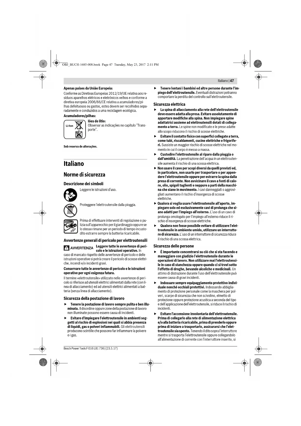 Tomada, cabo de rede ou carregador com de- feito Controlar a tensão de rede, se necessário, per- mitir que o carregador seja controlado por uma oficina de serviço autorizada para ferramentas elétricas Bosch Sintomas Possível causa Solução OBJ_BUCH-1685-008.book Page 46 Tuesday, May 23, 2017 2:11 PMItaliano | 47 Bosch Power Tools F 016 L81 736 | (23.5.17) Apenas países da União Europeia: Conforme as Diretivas Europeias 2012/19/UE relativa aos re- síduos aparelhos elétricos e eletrónicos velhos e conforme a diretiva europeia 2006/66/CE relativa a acumuladores/pi- lhas defeituosos ou gastos, estes devem ser recolhidos sepa- radamente e conduzidos a uma reciclagem ecológica. Acumuladores/pilhas: Iões de lítio: Observar as indicações no capítulo “Trans- porte”. Sob reserva de alterações. Italiano Norme di sicurezza Descrizione dei simboli Leggere le istruzioni d’uso. Proteggere l’elettroutensile dalla pioggia. Prima di effettuare interventi di regolazione o pu- lizia sull’apparecchio per il giardinaggio oppure se lo stesso rimane per un periodo di tempo incusto- dito estrarre sempre la batteria ricaricabile. Avvertenze generali di pericolo per elettroutensili Leggere tutte le avvertenze di peri- colo e le istruzioni operative. In caso di mancato rispetto delle avvertenze di pericolo e delle istruzioni operative si potrà creare il pericolo di scosse elettri- che, incendi e/o incidenti gravi. Conservare tutte le avvertenze di pericolo e le istruzioni operative per ogni esigenza futura. Il termine «elettroutensile» utilizzato nelle avvertenze di peri- colo si riferisce ad utensili elettrici alimentati dalla rete (con li- nea di allacciamento) ed ad utensili elettrici alimentati a bat- teria (senza linea di allacciamento). Sicurezza della postazione di lavoro Tenere la postazione di lavoro sempre pulita e ben illu- minata. Il disordine oppure zone della postazione di lavoro non illuminate possono essere causa di incidenti. Evitare d’impiegare l’elettroutensile in ambienti sog- getti al rischio di esplosioni nei quali si abbia presenza di liquidi, gas o polveri infiammabili. Gli elettroutensili producono scintille che possono far infiammare la polvere o i gas. Tenere lontani i bambini ed altre persone durante l’im- piego dell’elettroutensile. Eventuali distrazioni potranno comportare la perdita del controllo sull’elettroutensile. Sicurezza elettrica La spina di allacciamento alla rete dell’elettroutensile deve essere adatta alla presa. Evitare assolutamente di apportare modifiche alla spina. Non impiegare spine adattatrici assieme ad elettroutensili dotati di collega- mento a terra. Le spine non modificate e le prese adatte allo scopo riducono il rischio di scosse elettriche. Evitare il contatto fisico con superfici collegate a terra, come tubi, riscaldamenti, cucine elettriche e frigorife- ri. Sussiste un maggior rischio di scosse elettriche nel mo- mento in cui il corpo è messo a massa. Custodire l’elettroutensile al riparo dalla pioggia o dall’umidità. La penetrazione dell’acqua in un elettrouten- sile aumenta il rischio di una scossa elettrica. Non usare il cavo per scopi diversi da quelli previsti ed, in particolare, non usarlo per trasportare o per appen- dere l’elettroutensile oppure per estrarre la spina dalla presa di corrente. Non avvicinare il cavo a fonti di calo- re, olio, spigoli taglienti e neppure a parti della macchi- na che siano in movimento. I cavi danneggiati o aggrovi- gliati aumentano il rischio d’insorgenza di scosse elettriche. Qualora si voglia usare l’elettroutensile all’aperto, im- piegare solo ed esclusivamente cavi di prolunga che si- ano adatti per l’impiego all’esterno. L’uso di un cavo di prolunga omologato per l’impiego all’esterno riduce il ri- schio d’insorgenza di scosse elettriche. Qualora non fosse possibile evitare di utilizzare l’elet- troutensile in ambiente umido, utilizzare un interrutto- re di sicurezza. L’uso di un interruttore di sicurezza riduce il rischio di una scossa elettrica. Sicurezza delle persone È importante concentrarsi su ciò che si sta facendo e maneggiare con giudizio l’elettroutensile durante le operazioni di lavoro. Non utilizzare mai l’elettroutensi- le in caso di stanchezza oppure quando ci si trovi sotto l’effetto di droghe, bevande alcoliche e medicinali. Un attimo di distrazione durante l’uso dell’elettroutensile può essere causa di gravi incidenti. Indossare sempre equipaggiamento protettivo indivi- duale nonché occhiali protettivi. Indossando abbiglia- mento di protezione personale come la maschera per pol- veri, scarpe di sicurezza che non scivolino, elmetto di protezione oppure protezione acustica a seconda del tipo e dell’applicazione dell’elettroutensile, si riduce il rischio di incidenti. Evitare l’accensione involontaria dell’elettroutensile. Prima di collegarlo alla rete di alimentazione elettrica e/o alla batteria ricaricabile, prima di prenderlo oppure prima di iniziare a trasportarlo, assicurarsi che l’elet- troutensile sia spento. Tenendo il dito sopra l’interruttore mentre si trasporta l’elettroutensile oppure collegandolo all’alimentazione di corrente con l’interruttore inserito, si AVVERTENZA OBJ_BUCH-1685-008.book Page 47 Tuesday, May 23, 2017 2:11 PM48 | Italiano F 016 L81 736 | (23.5.17) Bosch Power Tools vengono a creare situazioni pericolose in cui possono veri- ficarsi seri incidenti. Prima di accendere l’elettroutensile togliere gli attrez- zi di regolazione o la chiave inglese. Un accessorio oppu- re una chiave che si trovi in una parte rotante della macchi- na può provocare seri incidenti. Evitare una posizione anomala del corpo. Avere cura di mettersi in posizione sicura e di mantenere l’equilibrio in ogni situazione. In questo modo è possibile controllare meglio l’elettroutensile in caso di situazioni inaspettate. Indossare vestiti adeguati. Non indossare vestiti lar- ghi, né portare brac