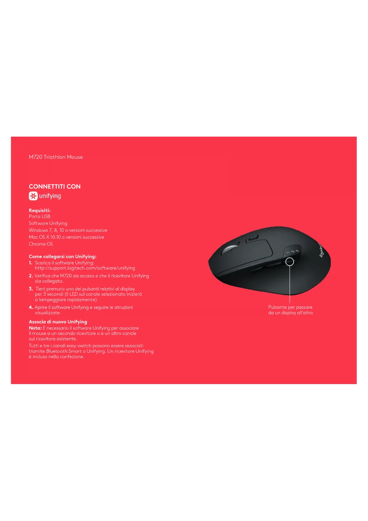 visualizzate. Associa di nuovo Unifying Nota: È necessario il software Unifying per associare il mouse a un secondo ricevitore o a un altro canale sul ricevitore esistente. Tutti e tre i canali easy-switch possono essere associati tramite Bluetooth Smart o Unifying. Un ricevitore Unifying è incluso nella confezione. Pulsante per passare da un display all'altroM720 Triathlon Mouse CONNETTITI CON Requisiti: Il dispositivo deve supportare Bluetooth Smart – Windows 8 o versioni successive – Mac OS X 10.10 o versioni successive – Android 5.0 o versioni successive Come associare un dispositivo Bluetooth: