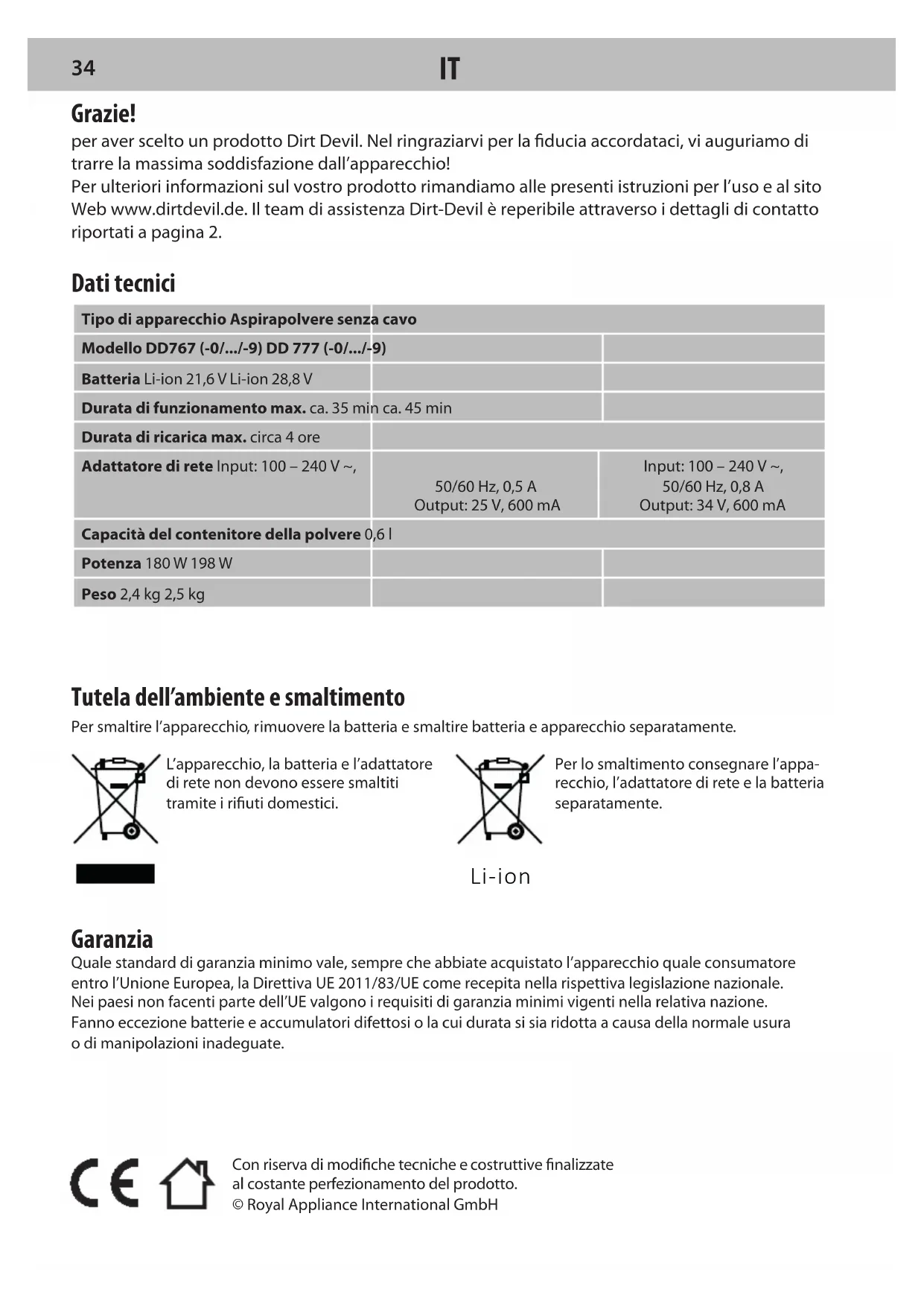 33Con riserva di modiche tecniche e costruttive nalizzate al costante perfezionamento del prodotto.© Royal Appliance International GmbH Grazie! per aver scelto un prodotto Dirt Devil. Nel ringraziarvi per la ducia accordataci, vi auguriamo di trarre la massima soddisfazione dall’apparecchio! Per ulteriori informazioni sul vostro prodotto rimandiamo alle presenti istruzioni per l’uso e al sito Web www.dirtdevil.de. Il team di assistenza Dirt-Devil è reperibile attraverso i dettagli di contatto riportati a pagina 2. Dati tecnici Tipo di apparecchio Aspirapolvere senza cavoModello DD767 (-0/.../-9) DD 777 (-0/.../-9)Batteria Li-ion 21,6 V Li-ion 28,8 VDurata di funzionamento max. ca. 35 min ca. 45 minDurata di ricarica max. circa 4 oreAdattatore di rete Input: 100 – 240 V ~, 50/60 Hz, 0,5 A Output: 25 V, 600 mAInput: 100 – 240 V ~, 50/60 Hz, 0,8 A Output: 34 V, 600 mACapacità del contenitore della polvere 0,6 lPotenza 180 W 198 WPeso 2,4 kg 2,5 kg Tutela dell’ambiente e smaltimento Per smaltire l’apparecchio, rimuovere la batteria e smaltire batteria e apparecchio separatamente. L’apparecchio, la batteria e l’adattatore di rete non devono essere smaltiti tramite i riuti domestici.Per lo smaltimento consegnare l’appa-recchio, l’adattatore di rete e la batteria separatamente. Garanzia Quale standard di garanzia minimo vale, sempre che abbiate acquistato l’apparecchio quale consumatore entro l’Unione Europea, la Direttiva UE 2011/83/UE come recepita nella rispettiva legislazione nazionale. Neipaesi non facenti parte dell’UE valgono i requisiti di garanzia minimi vigenti nella relativa nazione. Fannoeccezione batterie e accumulatori difettosi o la cui durata si sia ridotta a causa della normale usura odimanipolazioni inadeguate. Li-ion