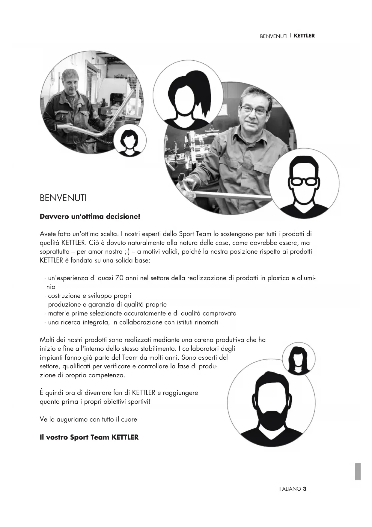 P1_Kettler_Handbuch_170629_01.indd 2 29.06.17 12:30ITALIANO 3 BENVENUTI | KETTLER BENVENUTI Davvero un'ottima decisione! Avete fatto un'ottima scelta. I nostri esperti dello Sport Team lo sostengono per tutti i prodotti di qualità KETTLER. Ciò è dovuto naturalmente alla natura delle cose, come dovrebbe essere, ma soprattutto – per amor nostro ;-) – a motivi validi, poiché la nostra posizione rispetto ai prodotti KETTLER è fondata su una solida base: