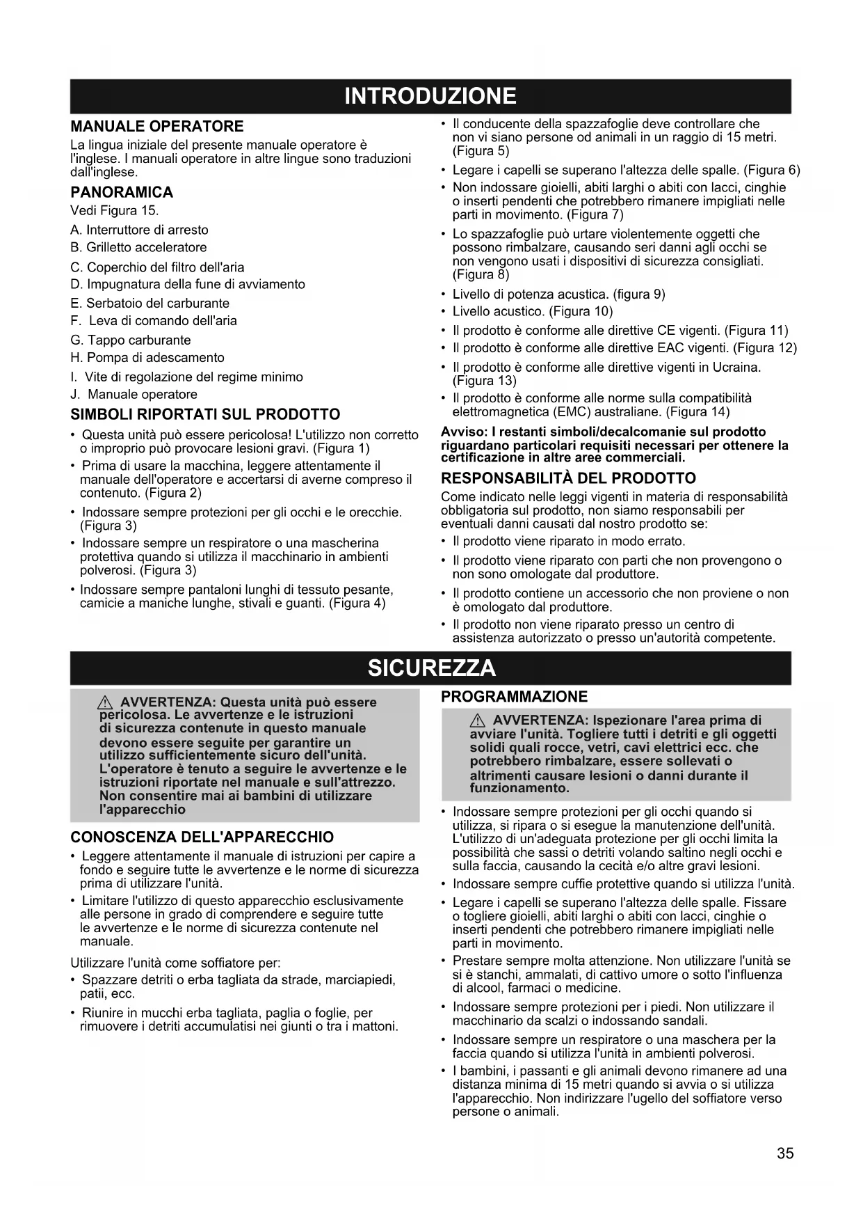 AVVERTENZA DI SICUREZZA: L'esposizione alle vibrazioni derivanti dall'uso prolongato di utensili alimentati a benzina cui causare danni alla circolazione o danneggiare i nervi delle dita, delle mani e delle giunture nelle persone soggette a problemi circolatori o goniatori anomali. L'uso prolongato in condizioni atmospheriche fredde è stato collegato a lesioni dei vasi circolatori in persona altrimenti sane. Al primo verificarsi di sintomi quali intorpidimento, dolore, perdita di forza, migliorada del colore e dell'aspetto esterno della pelle, o perdita della sensibilità nelle dita, nelle mani o nelle giunture, interrompere l'utilizzo di questo appearecchio e consultare il proprio medico. Unsystema anti-vibrazioni non garantisce l'eliminazione di questosti problemi. Gli utenti che impiegano strumenti elettrici su base regolare e continuativa devono controllare attentamente le proprie condizioni fisiche e lo stato di quello strumento.