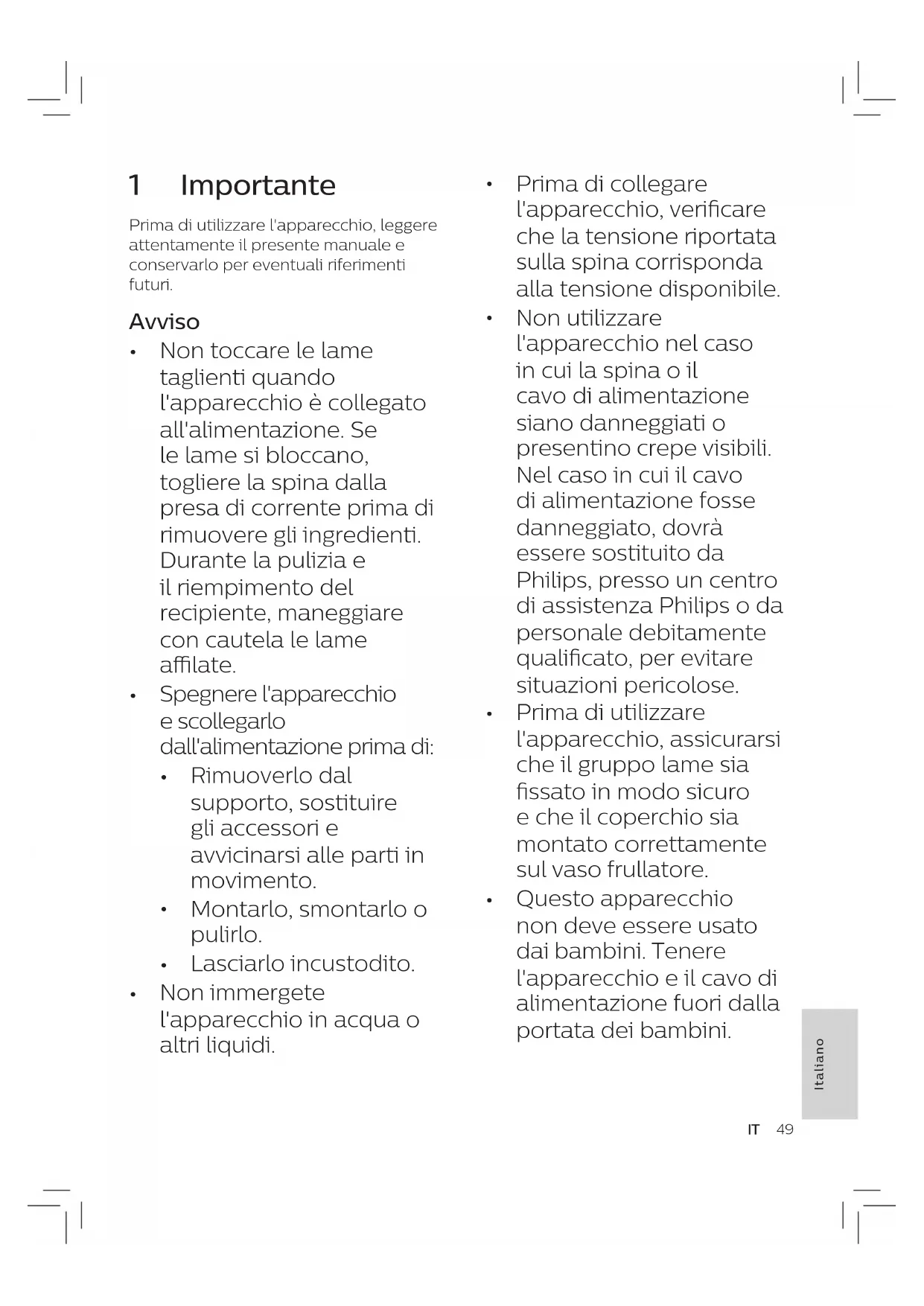 Questo apparecchio non deve essere usato dai bambini. Tenere l'apparecchio e il cavo di alimentazione fuori dalla portata dei bambini. 1 Importante Prima di utilizzare l'apparecchio, leggere attentamente il presente manuale e conservarlo per eventuali riferimenti futuri. Avviso
