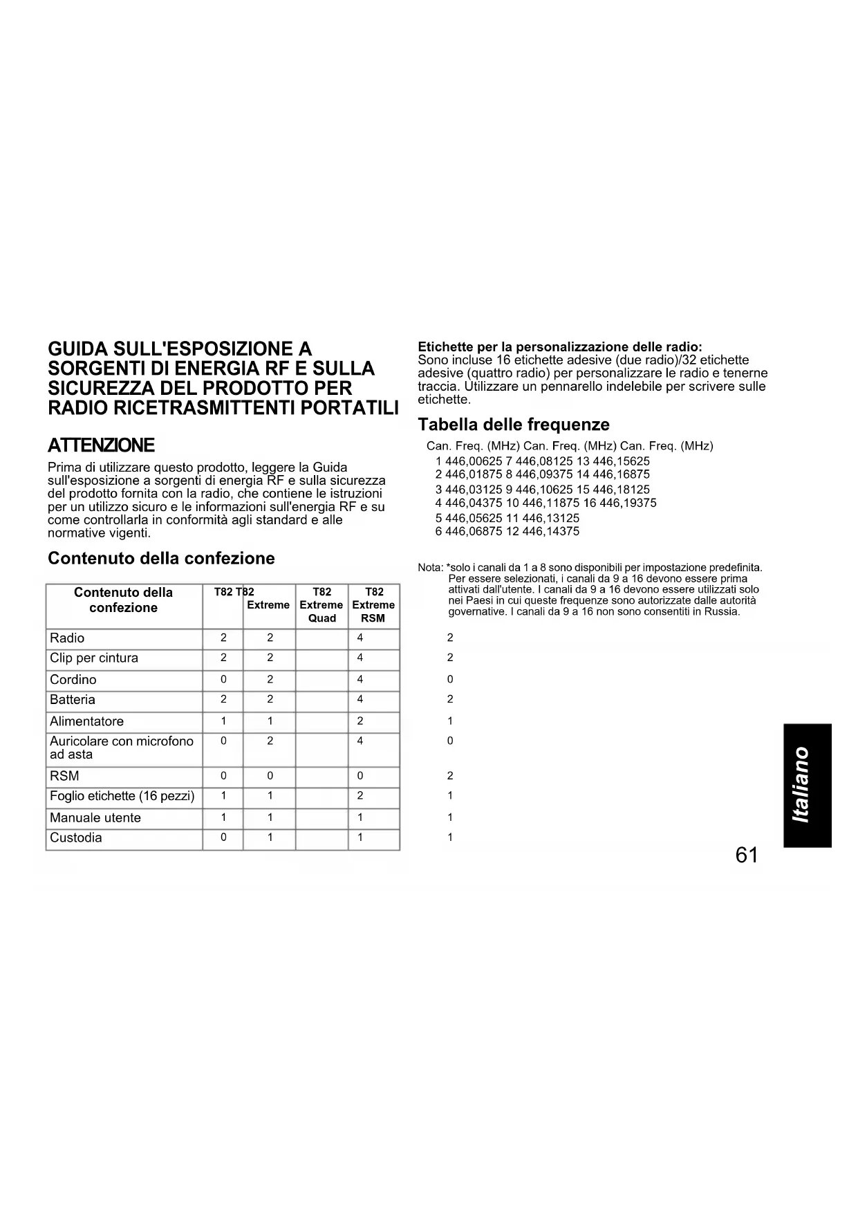ATTENZIONE Prima di utilizzare questo prodotto, leggere la Guida sull'esposizione a sorgenti di energia RF e sulla sicurezza del prodotto fornita con la radio, che contiene le istruzioni per un utilizzo sicuro e le informazioni sull'energia RF e su come controllarla in conformità agli standard e alle normative vigenti. Contenuto della confezione Etichette per la personalizzazione delle radio: Sono incluse 16 etichette adesive (due radio)/32 etichette adesive (quattro radio) per personalizzare le radio e tenerne traccia. Utilizzare un pennarello indelebile per scrivere sulle etichette. Tabella delle frequenze Nota: *solo i canali da 1 a 8 sono disponibili per impostazione predefinita. Per essere selezionati, i canali da 9 a 16 devono essere prima attivati dall'utente. I canali da 9 a 16 devono essere utilizzati solo nei Paesi in cui queste frequenze sono autorizzate dalle autorità governative. I canali da 9 a 16 non sono consentiti in Russia. Contenuto della confezione T82 T82 Extreme T82 Extreme Quad T82 Extreme RSM Radio Clip per cintura Cordino Batteria Alimentatore Auricolare con microfono ad asta RSM Foglio etichette (16 pezzi) Manuale utente Custodia 01 1 1Can. Freq. (MHz) Can. Freq. (MHz) Can. Freq. (MHz)1 446,00625 7 446,08125 13 446,156252 446,01875 8 446,09375 14 446,168753 446,03125 9 446,10625 15 446,181254 446,04375 10 446,11875 16 446,193755 446,05625 11 446,131256 446,06875 12 446,14375 MN003428A01.book Page 61 Tuesday, April 21, 2020 4:48 PM62 Italiano Funzioni e specifiche