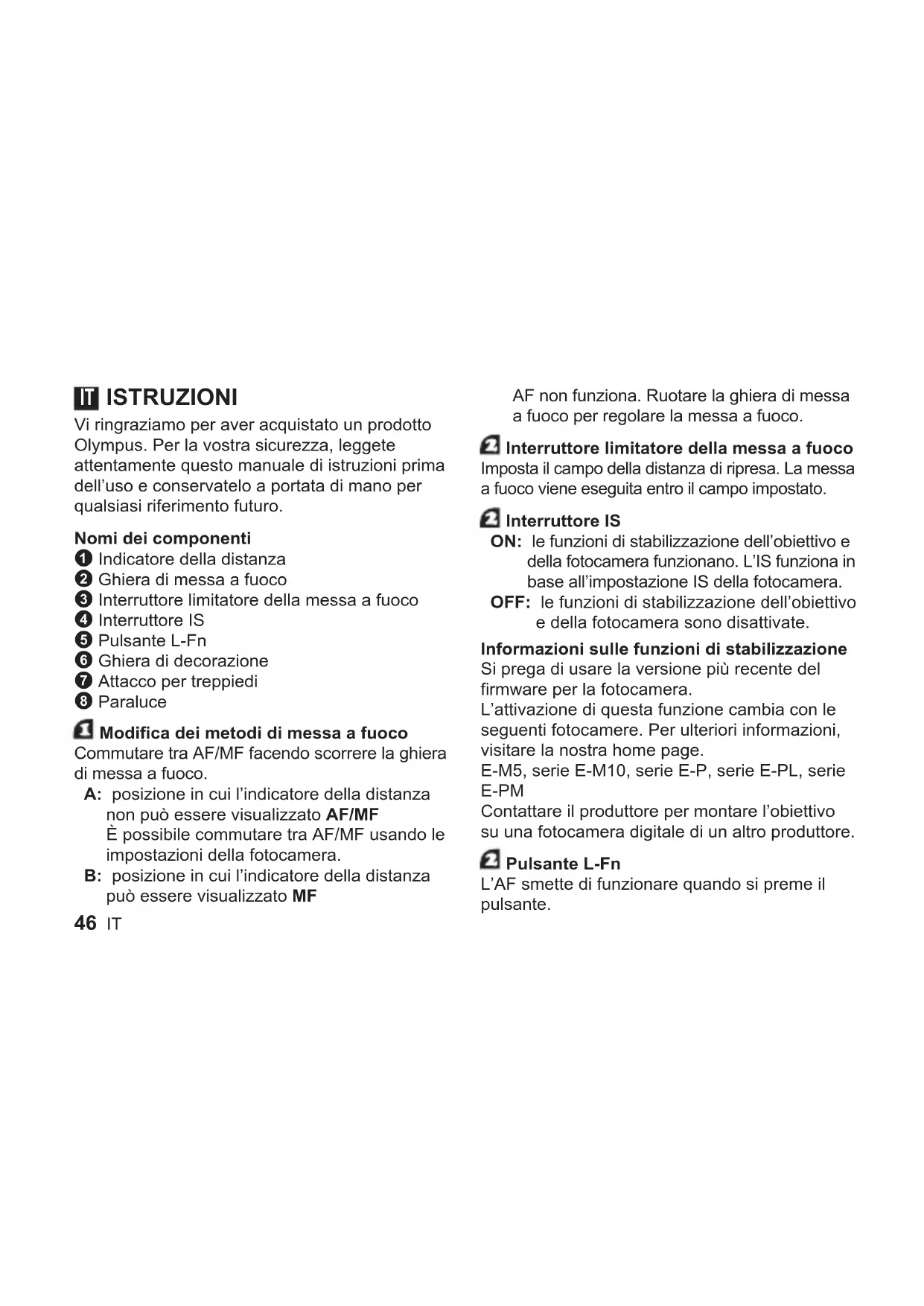 - 46 IT ISTRUZIONI Vi ringraziamo per aver acquistato un prodotto Olympus. Per la vostra sicurezza, leggete attentamente questo manuale di istruzioni prima dell’uso e conservatelo a portata di mano per qualsiasi riferimento futuro. Nomi dei componenti 1 Indicatore della distanza 2 Ghiera di messa a fuoco 3 Interruttore limitatore della messa a fuoco 4 Interruttore IS 5 Pulsante L-Fn 6 Ghiera di decorazione 7 Attacco per treppiedi 8 Paraluce Modifica dei metodi di messa a fuoco Commutare tra AF/MF facendo scorrere la ghiera di messa a fuoco. A: posizione in cui l’indicatore della distanza non può essere visualizzato AF/MF È possibile commutare tra AF/MF usando le impostazioni della fotocamera. B: posizione in cui l’indicatore della distanza può essere visualizzato MF AF non funziona. Ruotare la ghiera di messa a fuoco per regolare la messa a fuoco. Interruttore limitatore della messa a fuoco Imposta il campo della distanza di ripresa. La messa a fuoco viene eseguita entro il campo impostato. Interruttore IS ON: le funzioni di stabilizzazione dell’obiettivo e della fotocamera funzionano. L’IS funziona in base all’impostazione IS della fotocamera. OFF: le funzioni di stabilizzazione dell’obiettivo e della fotocamera sono disattivate. Informazioni sulle funzioni di stabilizzazione Si prega di usare la versione più recente del firmware per la fotocamera. L’attivazione di questa funzione cambia con le seguenti fotocamere. Per ulteriori informazioni, visitare la nostra home page. E-M5, serie E-M10, serie E-P, serie E-PL, serie E-PM Contattare il produttore per montare l’obiettivo su una fotocamera digitale di un altro produttore. Pulsante L-Fn L’AF smette di funzionare quando si preme il pulsante. ITIT 47 Rimozione dell’attacco per treppiedi e installazione della ghiera di decorazione Rimozione dell’attacco per treppiedi: Ruotare la manopola dell’attacco per treppiedi verso sinistra per allentarla 1. Ruotare l’attacco per treppiedi verso sinistra, allinearlo con il segno 2, quindi rimuoverlo dal corpo dell’obiettivo 3. Installazione della ghiera di decorazione: Allineare i segni e inserire la ghiera di decorazione 1, quindi ruotarla a destra finché non si arresta 2. Come utilizzare il paraluce Tirarlo verso l’esterno finché non si arresta 1, quindi ruotarlo a destra 2. Il paraluce non può essere rimosso dall’obiettivo. Note sulla ripresa