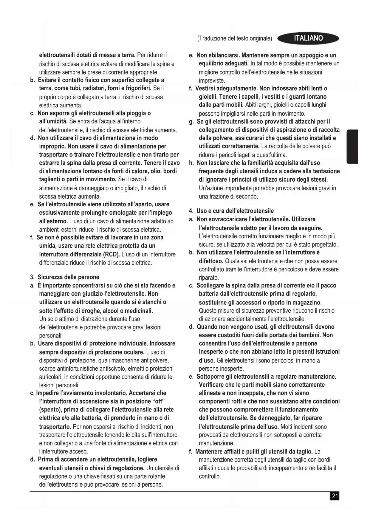 e. Non sbilanciarsi. Mantenere sempre un appoggio e un equilibrio adeguati. In tal modo è possibile mantenere un migliore controllo dell'elettroutensile nelle situazioni impreviste.