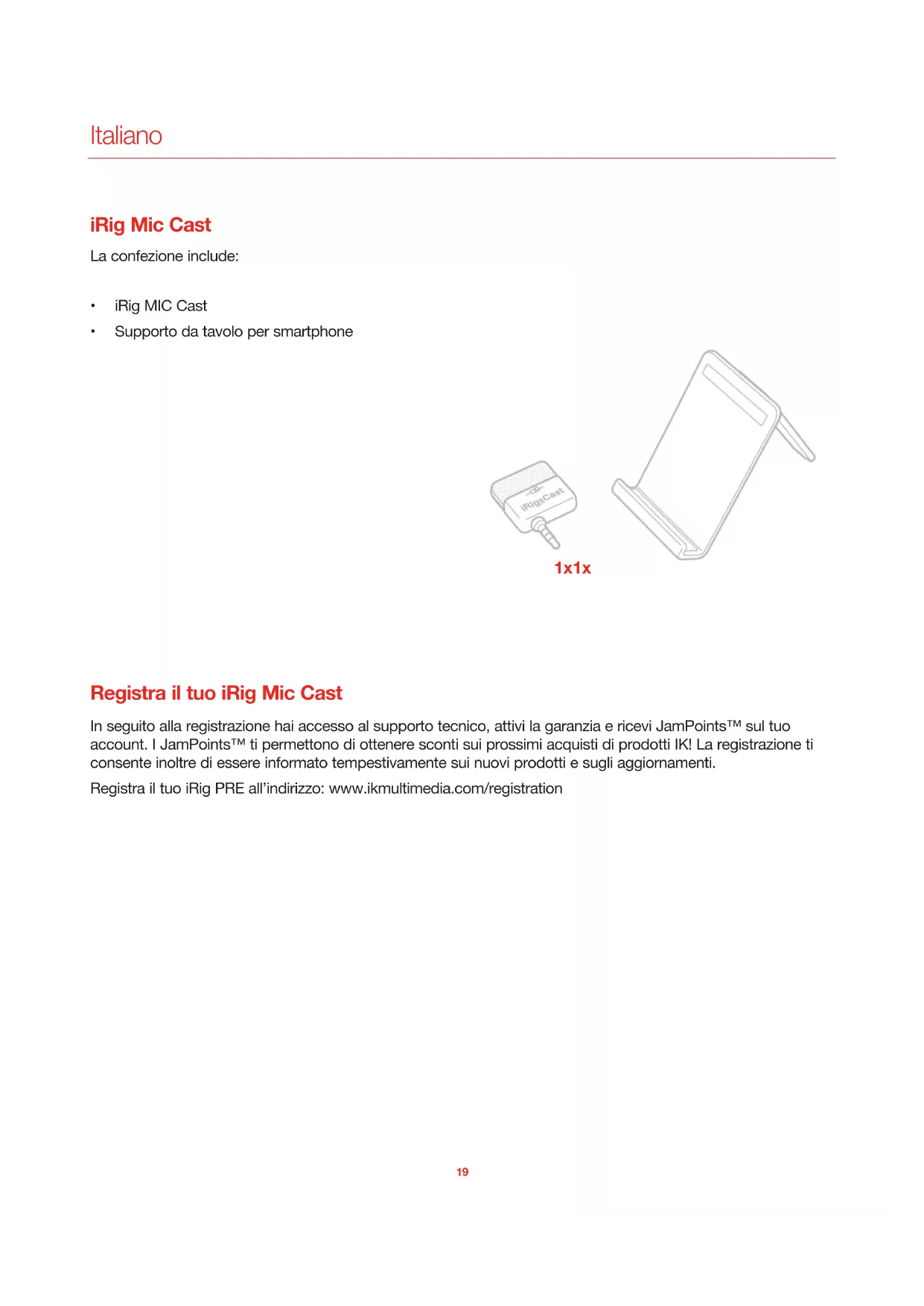 In seguito alla registrazione hai accesso al supporto tecnico, attivi la garanzia e ricevi JamPoints™ sul suo account. I JamPoints™ ti permettono di ottener sconti sui prossimi acquisti di prodotti IK! La registrazione ti consente inolte di essere informatato tempestamente sui nuovi prodotti e sugli aggiornamenti.