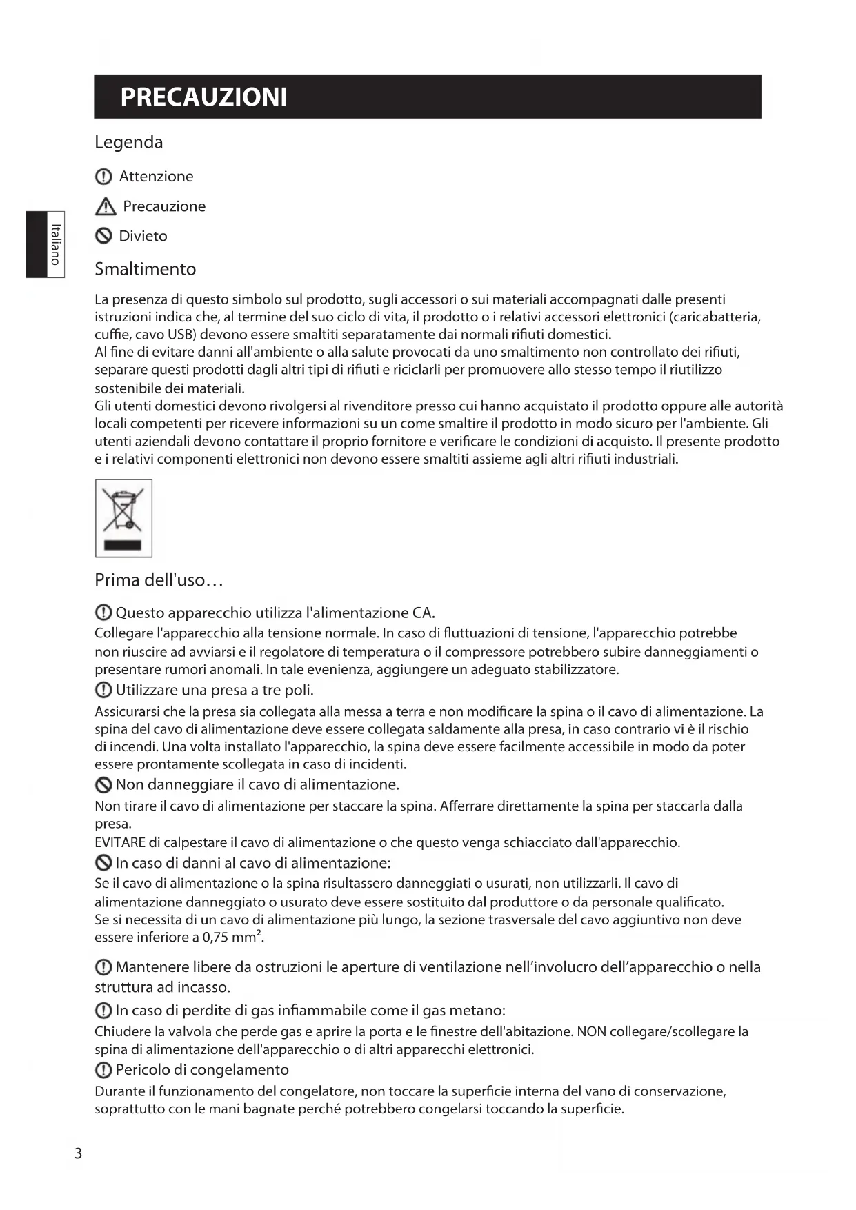 Legenda Attenzione Precauzione Divieto Smaltimento La presenza di questo simbolo sul prodotto, sugli accessori o sui materiali accompagnati dalle presenti istruzioni indica che, al termine del suo ciclo di vita, il prodotto o i relativi accessori elettronici (caricabatteria, cue, cavo USB) devono essere smaltiti separatamente dai normali riuti domestici. Al ne di evitare danni all'ambiente o alla salute provocati da uno smaltimento non controllato dei riuti, separare questi prodotti dagli altri tipi di riuti e riciclarli per promuovere allo stesso tempo il riutilizzo sostenibile dei materiali. Gli utenti domestici devono rivolgersi al rivenditore presso cui hanno acquistato il prodotto oppure alle autorità locali competenti per ricevere informazioni su un come smaltire il prodotto in modo sicuro per l'ambiente. Gli utenti aziendali devono contattare il proprio fornitore e vericare le condizioni di acquisto. Il presente prodotto e i relativi componenti elettronici non devono essere smaltiti assieme agli altri riuti industriali. Prima dell'uso… Questo apparecchio utilizza l'alimentazione CA. Collegare l'apparecchio alla tensione normale. In caso di uttuazioni di tensione, l'apparecchio potrebbe non riuscire ad avviarsi e il regolatore di temperatura o il compressore potrebbero subire danneggiamenti o presentare rumori anomali. In tale evenienza, aggiungere un adeguato stabilizzatore. Utilizzare una presa a tre poli. Assicurarsi che la presa sia collegata alla messa a terra e non modicare la spina o il cavo di alimentazione. La spina del cavo di alimentazione deve essere collegata saldamente alla presa, in caso contrario vi è il rischio di incendi. Una volta installato l'apparecchio, la spina deve essere facilmente accessibile in modo da poter essere prontamente scollegata in caso di incidenti. Non danneggiare il cavo di alimentazione. Non tirare il cavo di alimentazione per staccare la spina. Aerrare direttamente la spina per staccarla dalla presa. EVITARE di calpestare il cavo di alimentazione o che questo venga schiacciato dall'apparecchio. In caso di danni al cavo di alimentazione: Se il cavo di alimentazione o la spina risultassero danneggiati o usurati, non utilizzarli. Il cavo di alimentazione danneggiato o usurato deve essere sostituito dal produttore o da personale qualicato. Se si necessita di un cavo di alimentazione più lungo, la sezione trasversale del cavo aggiuntivo non deve essere inferiore a 0,75 mm². Mantenere libere da ostruzioni le aperture di ventilazione nell’involucro dell’apparecchio o nella struttura ad incasso. In caso di perdite di gas inammabile come il gas metano: Chiudere la valvola che perde gas e aprire la porta e le nestre dell'abitazione. NON collegare/scollegare la spina di alimentazione dell'apparecchio o di altri apparecchi elettronici. Pericolo di congelamento Durante il funzionamento del congelatore, non toccare la supercie interna del vano di conservazione, soprattutto con le mani bagnate perché potrebbero congelarsi toccando la supercie. PRECAUZIONI4 PRECAUZIONI Italiano In caso di disuso dell'apparecchio: Tenere l'apparecchio lontano dalle amme per evitare incidenti. Rimuovere lo sportello (aprire lo sportello e sorreggerlo prima di rimuovere le viti) per evitare il rischio di incidenti se dei bambini entrano nell'apparecchio. Smaltire l'apparecchio nel luogo preposto. Aprire lo sportello dalla maniglia. Non conservare o utilizzare benzina o altre sostanze inammabili in prossimità del congelatore per evitare il rischio di incendi. Non conservare mai nel congelatore sostanze acide altamente corrosive, esplosive o inammabili, alcaline e altre sostanze chimiche. Non conservare mai nel congelatore bottiglie contenenti bevande perché potrebbero esplodere durante il congelamento. Non utilizzare apparecchi elettrici nei vani di conservazione degli alimenti, ad eccezione di quelli di tipo consigliato dal produttore. Prestare attenzione ai bambini Sorvegliare i bambini, in modo da assicurarsi che non giochino con l'apparecchio. Non appendersi allo sportello poiché questo o l'apparecchio potrebbero cadere con il rischio di lesioni personali. Assicurarsi che i bambini non inseriscano mani o piedi nei fori o nelle giunture laterali delle parti in metallo come il vano o il retro dell'apparecchio per evitare il rischio di lesioni personali. Non poggiare sull'apparecchio oggetti poco stabili (oggetti pesanti, contenitori d'acqua) poiché potrebbero cadere o rovesciarsi provocando lesioni personali o scosse elettriche. Tenere lontano dall'acqua Non spruzzare o rovesciare acqua nel congelatore per pulirlo. Non collocare l'apparecchio in ambienti umidi o dove è facilmente raggiungibile da schizzi d'acqua per evitare che ciò inuisca sulle prestazioni dell'isolamento elettrico o provochi scosse elettriche o incendi. Non danneggiare il circuito del refrigeratore Il disassemblaggio del congelatore ed eventuali modiche devono essere autorizzati. Qualsiasi movimento brusco esercitato sul congelatore può danneggiare i tubi del sistema di rareddamento. L'apparecchio deve essere riparato da personale qualicato. Scollegare la spina di alimentazione: Prima della pulizia e della manutenzione o in caso di spegnimento o guasti all'apparecchio. Dopo aver scollegato l'apparecchio, attendere almeno 5 minuti prima di riavviarlo, poiché riavvii frequenti possono danneggiare il compressore. Questo congelatore è per uso domestico ed è destinato esclusivamente alla conservazione di alimenti. Non conservare sangue, medicine, prodotti biologici o altri prodotti. Mantenere libere da ostruzioni le aperture di ventilazione nell’involucro dell’apparecchio o nella struttura ad incasso. L'utilizzo di questo apparecchio non è idoneo per persone con capacità siche, sensoriali o mentali ridotte (inclusi bambini) o senza un'adeguata esperienza e conoscenza del suo utilizzo, a meno che non vengano sorvegliate o ricevano istruzioni da una persona responsabile della loro sicure