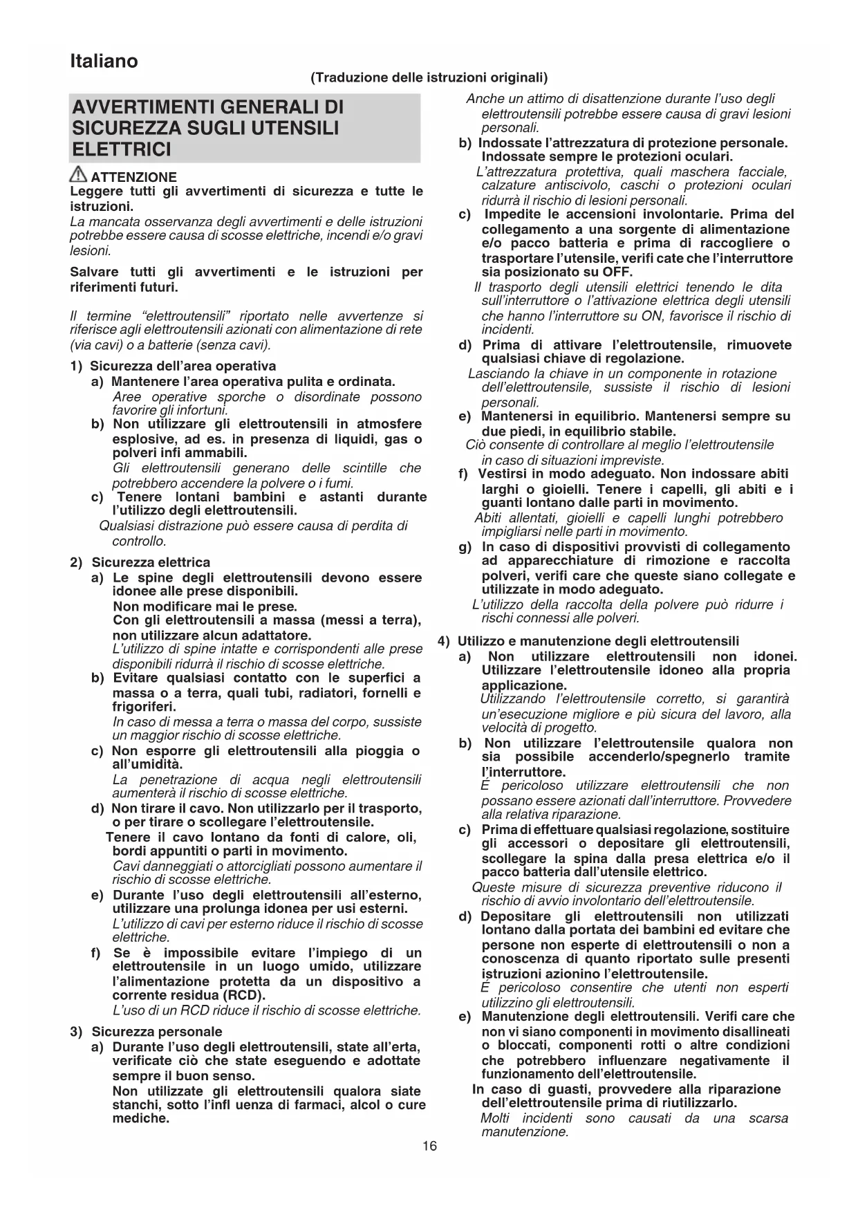 ELETTRICI ATTENZIONE Leggere tutti gli avvertimenti di sicurezza e tutte le istruzioni. La mancata osservanza degli avvertimenti e delle istruzioni potrebbe essere causa di scosse elettriche, incendi e/o gravi lesioni. Salvare tutti gli avvertimenti e le istruzioni per riferimenti futuri. Il termine “elettroutensili” riportato nelle avvertenze si riferisce agli elettroutensili azionati con alimentazione di rete (via cavi) o a batterie (senza cavi).