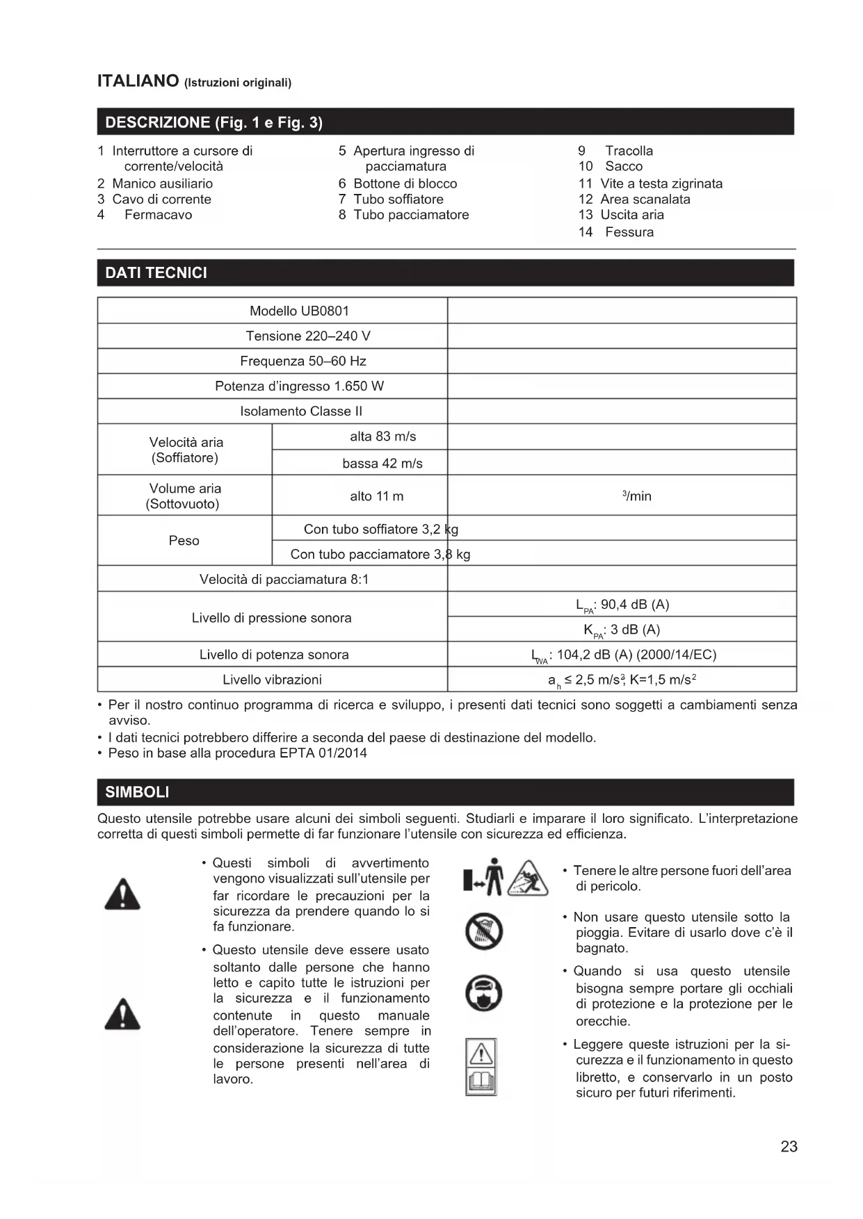 | Livello di potenza sonora | LWA: 104,2 dB (A) (2000/14/EC) | |