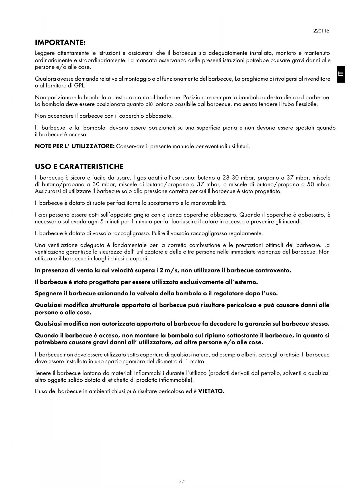 Il barbecue è sicuro e facile da usare. I gas adatti all’uso sono: butano a 28-30 mbar, propano a 37 mbar, miscele di butano/propano a 30 mbar, miscele di butano/propano a 37 mbar, o miscele di butano/propano a 50 mbar. Assicurarsi di utilizzare il barbecue solo alla pressione corretta per cui il barbecue è stato progettato. Il barbecue è dotato di ruote per facilitarne lo spostamento e la manovrabilità. I cibi possono essere cotti sull’apposita griglia con o senza coperchio abbassato. Quando il coperchio è abbassato, è necessario sollevarlo ogni 5 minuti per 1 minuto per far fuoriuscire il calore in eccesso e prevenire gli incendi. Il barbecue è dotato di vassoio raccogligrasso. Pulire il vassoio raccogligrasso regolarmente. Una ventilazione adeguata è fondamentale per la corretta combustione e le prestazioni ottimali del barbecue. La ventilazione garantisce la sicurezza dell’ utilizzatore e delle altre persone nelle immediate vicinanze del barbecue. Non utilizzare il barbecue in luoghi chiusi e coperti. In presenza di vento la cui velocità supera i 2 m/s, non utilizzare il barbecue controvento. Il barbecue è stato progettato per essere utilizzato esclusivamente all’esterno. Spegnere il barbecue azionando la valvola della bombola o il regolatore dopo l’uso. Qualsiasi modifica strutturale apportata al barbecue può risultare pericolosa e può causare danni alle persone o alle cose. Qualsiasi modifica non autorizzata apportata al barbecue fa decadere la garanzia sul barbecue stesso. Quando il barbecue è acceso, non montare la bombola sul ripiano sottostante il barbecue, in quanto si potrebbero causare gravi danni all’ utilizzatore, ad altre persone e/o alle cose. Il barbecue non deve essere utilizzato sotto coperture di qualsiasi natura, ad esempio alberi, cespugli o tettoie. Il barbecue deve essere installato in uno spazio sgombro del diametro di 1 metro. Tenere il barbecue lontano da materiali infiammabili durante l’utilizzo (prodotti derivati dal petrolio, solventi o qualsiasi altro oggetto solido dotato di etichetta di prodotto infiammabile). L’uso del barbecue in ambienti chiusi può risultare pericoloso ed è VIETATO. IT38