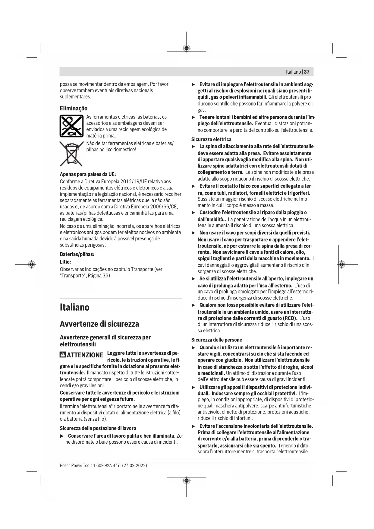 e per lo stoccaggio °C –15…+50 Batterie consigliate GBA 18V… ProCORE18V… Caricabatteria consigliati GAL 18… GAX 18… GAL 36… A) a vuoto, con regolazione al massimo della rotellina di preselezio- ne, a 20–25°C B) in funzione della batteria utilizzata C) prestazioni ridotte in caso di temperature <0°C Informazioni su rumorosità e vibrazioni Valori di emissione acustica rilevati conformemente a EN62841-1. Il livello di pressione acustica ponderato A dell’elettroutensi- le è tipicamente inferiore a 70dB(A). Il livello di rumorosità durante il lavoro può superare i valori indicati. Indossare protezioni acustiche! Valori di oscillazione totali a