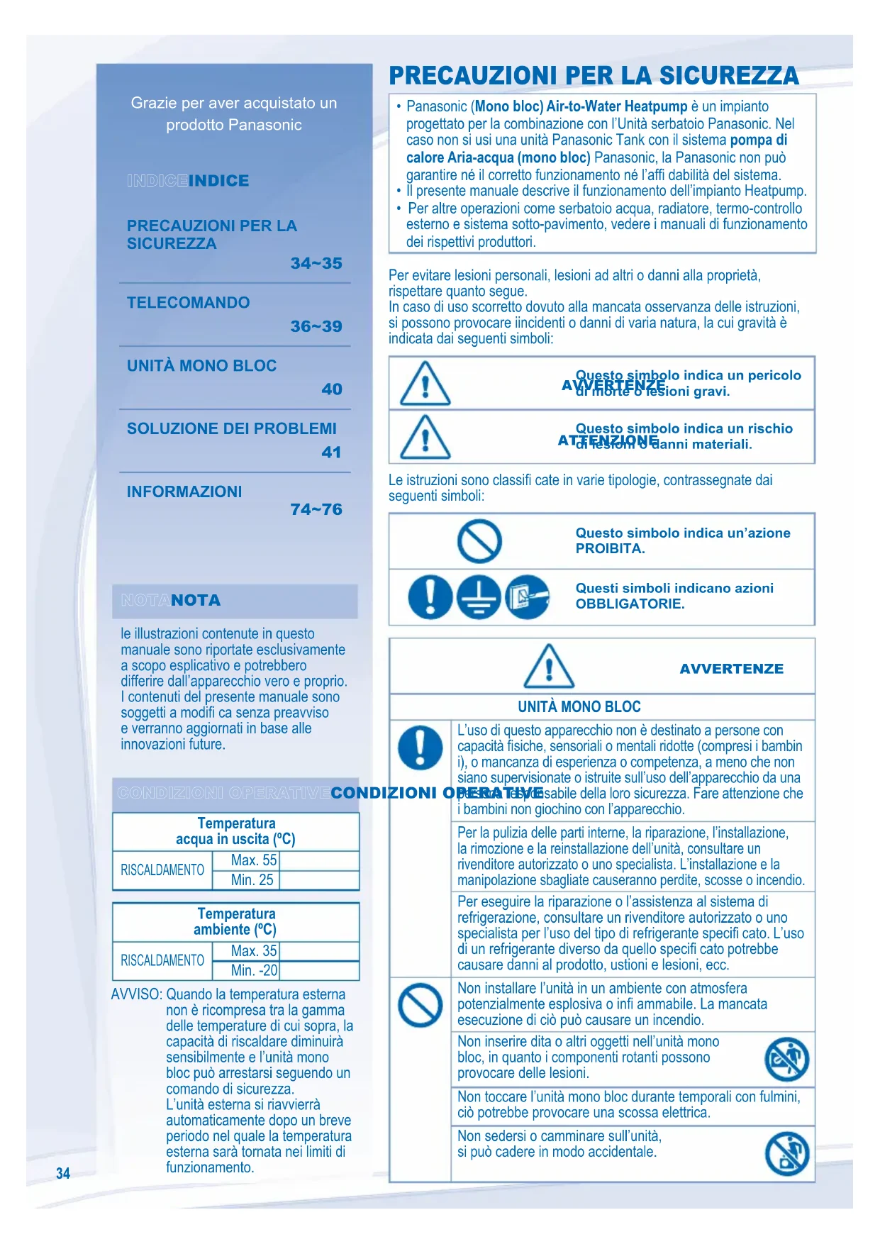 - Panasonic (Mono bloc) Air-to-Water Heatpump è un impianto progettato per la combinazione con l’Unità serbatoio Panasonic. Nel caso non si usi una unità Panasonic Tank con il sistema pompa di calore Aria-acqua (mono bloc) Panasonic, la Panasonic non può garantire né il corretto funzionamento né l’affi dabilità del sistema.