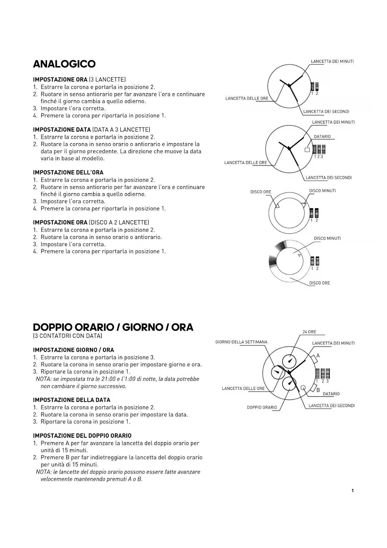 NOTA: la lancetta delle 24 ore si sposta insieme alle lancette delle ore e dei minuti. Quando si imposta l’ora, controllare che la lancetta delle 24 ore sia impostata correttamente.