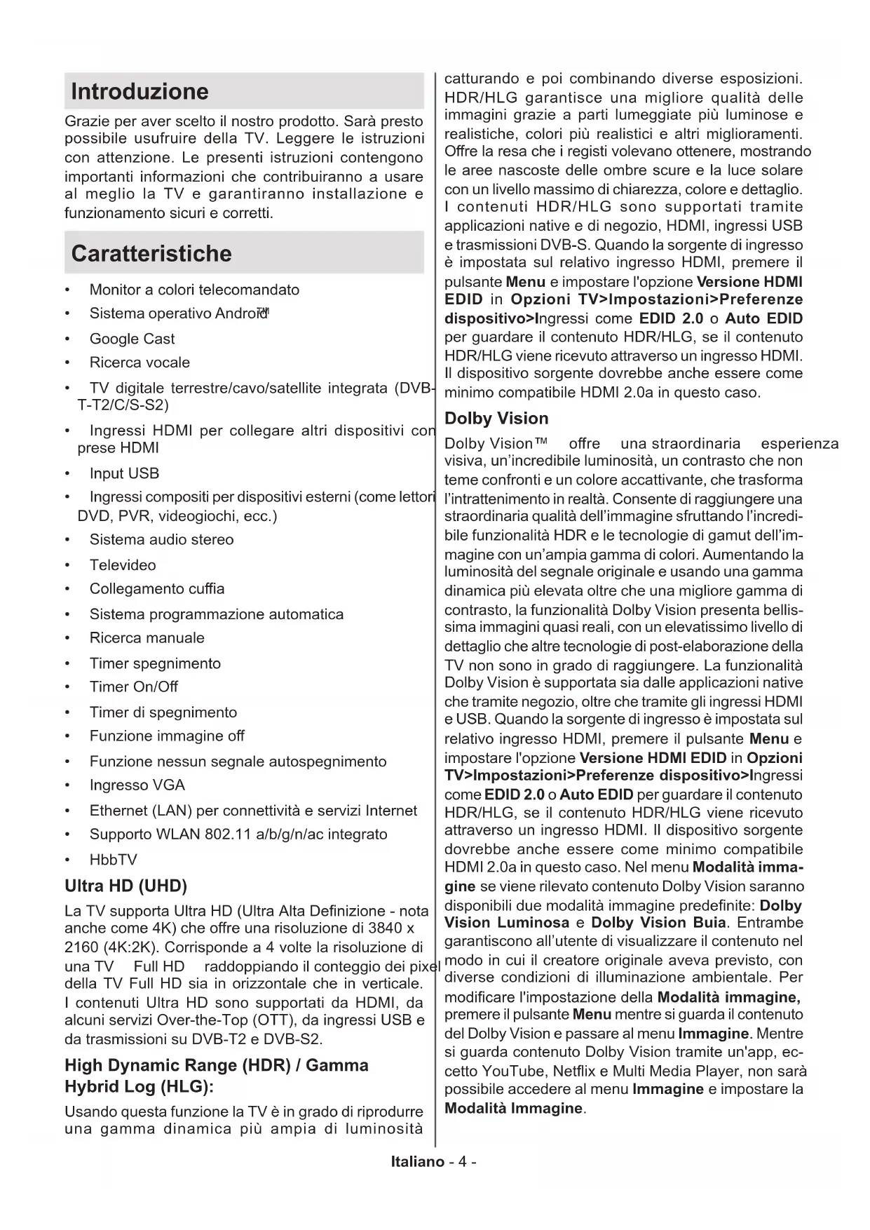 - HbbTV Ultra HD (UHD) LaTVsupportaUltraHD(UltraAltaDenizione-nota anchecome4K)cheoreunarisoluzionedi3840x 2160 (4K:2K). Corrisponde a 4 volte la risoluzione di unaTV FullHD raddoppiandoilconteggiodeipixel della TV Full HD sia in orizzontale che in verticale. I contenuti Ultra HD sono supportati da HDMI, da alcuni servizi Over-the-Top (OTT), da ingressi USB e da trasmissioni su DVB-T2 e DVB-S2. High Dynamic Range (HDR) / Gamma Hybrid Log (HLG): Usando questa funzione la TV è in grado di riprodurre una gamma dinamica più ampia di luminosità catturando e poi combinando diverse esposizioni. HDR/HLG garantisce una migliore qualità delle immagini grazie a parti lumeggiate più luminose e realistiche, colori più realistici e altri miglioramenti. Orelaresacheiregistivolevanoottenere,mostrando le aree nascoste delle ombre scure e la luce solare con un livello massimo di chiarezza, colore e dettaglio. I contenuti HDR/HLG sono supportati tramite applicazioni native e di negozio, HDMI, ingressi USB e trasmissioni DVB-S. Quando la sorgente di ingresso è impostata sul relativo ingresso HDMI, premere il pulsante Menu e impostare l'opzione Versione HDMI EDID in Opzioni TV>Impostazioni>Preferenze dispositivo>Ingressi come EDID 2.0 o Auto EDID per guardare il contenuto HDR/HLG, se il contenuto HDR/HLG viene ricevuto attraverso un ingresso HDMI. Il dispositivo sorgente dovrebbe anche essere come minimo compatibile HDMI 2.0a in questo caso. Dolby Vision DolbyVision™ ore unastraordinaria esperienza visiva, un’incredibile luminosità, un contrasto che non teme confronti e un colore accattivante, che trasforma l’intrattenimento in realtà. Consente di raggiungere una straordinaria qualità dell’immagine sfruttando l’incredi- bile funzionalità HDR e le tecnologie di gamut dell’im- magine con un’ampia gamma di colori. Aumentando la luminosità del segnale originale e usando una gamma dinamica più elevata oltre che una migliore gamma di contrasto, la funzionalità Dolby Vision presenta bellis- sima immagini quasi reali, con un elevatissimo livello di dettaglio che altre tecnologie di post-elaborazione della TV non sono in grado di raggiungere. La funzionalità Dolby Vision è supportata sia dalle applicazioni native che tramite negozio, oltre che tramite gli ingressi HDMI e USB. Quando la sorgente di ingresso è impostata sul relativo ingresso HDMI, premere il pulsante Menu e impostare l'opzione Versione HDMI EDID in Opzioni TV>Impostazioni>Preferenze dispositivo>Ingressi come EDID 2.0 o Auto EDID per guardare il contenuto HDR/HLG, se il contenuto HDR/HLG viene ricevuto attraverso un ingresso HDMI. Il dispositivo sorgente dovrebbe anche essere come minimo compatibile HDMI 2.0a in questo caso. Nel menu Modalità imma- gine se viene rilevato contenuto Dolby Vision saranno disponibiliduemodalitàimmaginepredenite:Dolby Vision Luminosa e Dolby Vision Buia. Entrambe garantiscono all’utente di visualizzare il contenuto nel modo in cui il creatore originale aveva previsto, con diverse condizioni di illuminazione ambientale. Per modicarel'impostazionedellaModalità immagine, premere il pulsante Menu mentre si guarda il contenuto del Dolby Vision e passare al menu Immagine. Mentre si guarda contenuto Dolby Vision tramite un'app, ec- cettoYouTube,NetixeMultiMediaPlayer,nonsarà possibile accedere al menu Immagine e impostare la Modalità Immagine.Italiano - 5 - Installazione supporto e montaggio a parete Montaggio / Rimozione del piedistallo Preparazione Estrarre il piedistallo e la TV dall’imballaggio, quindi mettere il piedistallo su un ripiano di lavoro o su qualsiasialtrasuperciepiana.