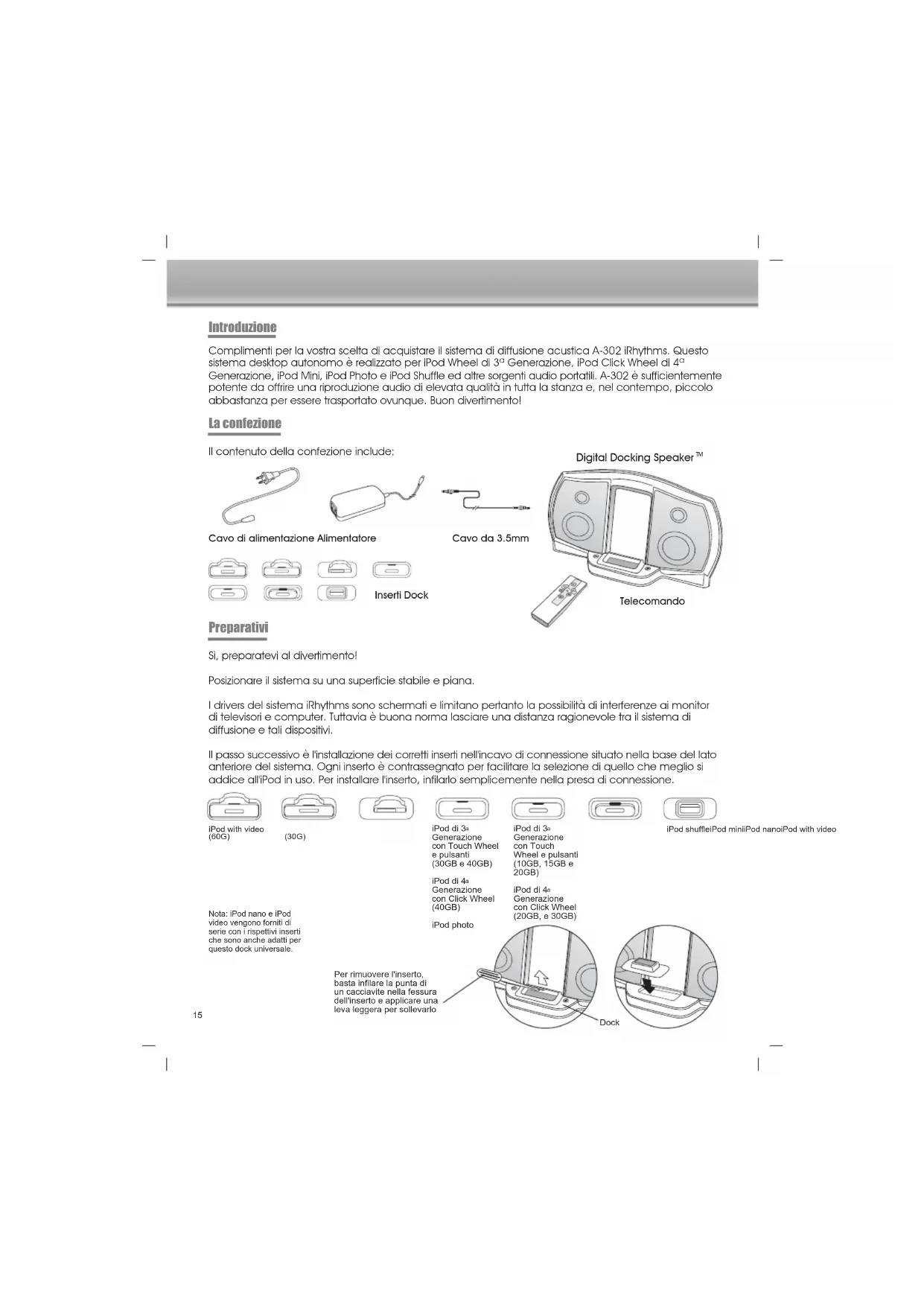sistema desktop autonomo è realizzato per iPod Wheel di 3^a Generazione, iPod Click Wheel di 4^a Generazione, iPod Mini, iPod Photo e iPod Shuffle ed altre sorgenti audio portatili. A-302 è sufficientemente potente da offrir une rproduzione audio di elevata qualita in alla stanza e, nel contempo, piccolo abbastanza per essere trasportato ovunque. Buon divertimento!