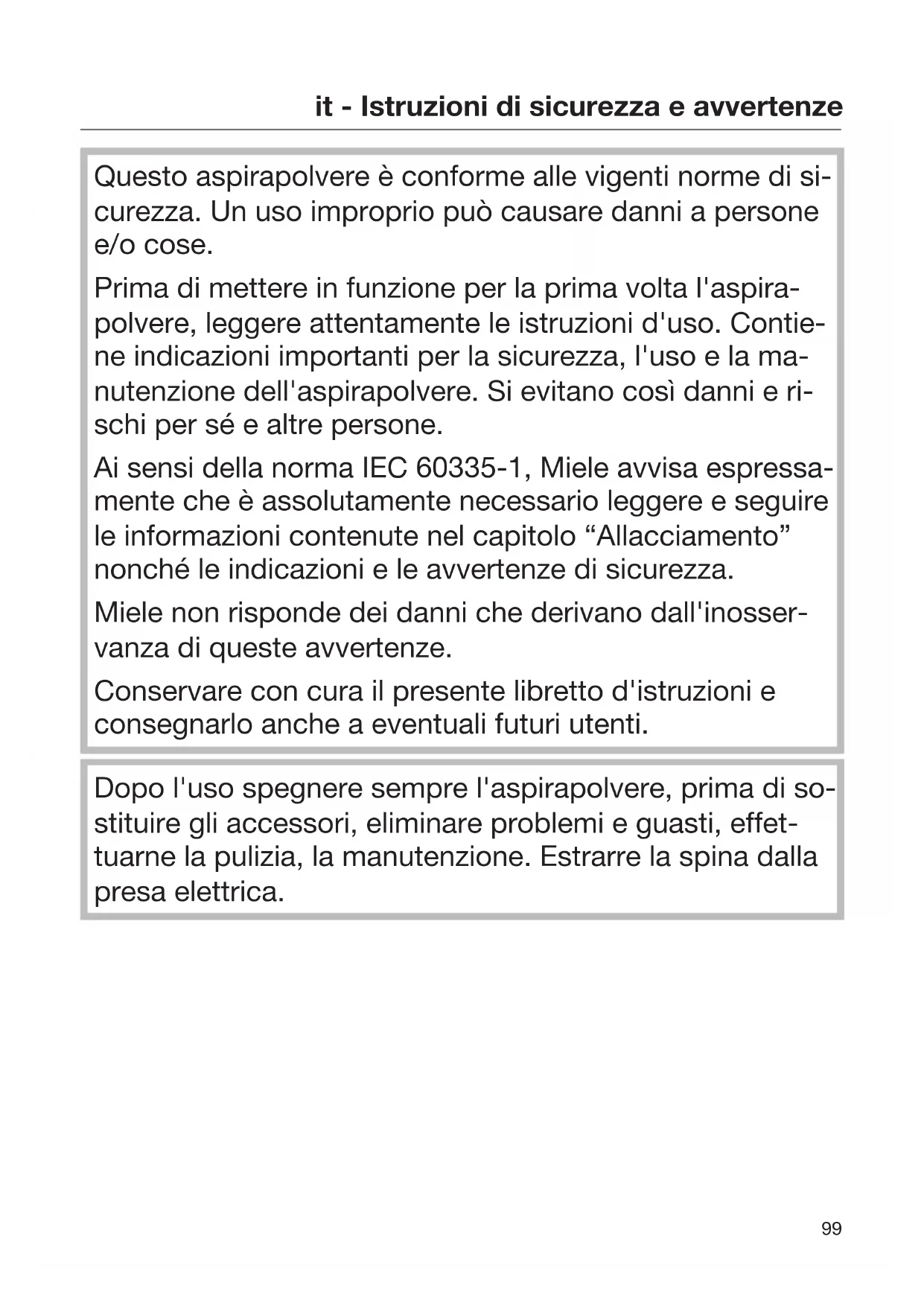 Questo aspirapolvere è conforme alle vigenti norme di si- curezza. Un uso improprio può causare danni a persone e/o cose. Prima di mettere in funzione per la prima volta l'aspira- polvere, leggere attentamente le istruzioni d'uso. Contie- ne indicazioni importanti per la sicurezza, l'uso e la ma- nutenzione dell'aspirapolvere. Si evitano così danni e ri- schi per sé e altre persone. Ai sensi della norma IEC 60335-1, Miele avvisa espressa- mente che è assolutamente necessario leggere e seguire le informazioni contenute nel capitolo “Allacciamento” nonché le indicazioni e le avvertenze di sicurezza. Miele non risponde dei danni che derivano dall'inosser- vanza di queste avvertenze. Conservare con cura il presente libretto d'istruzioni e consegnarlo anche a eventuali futuri utenti. Dopo l'uso spegnere sempre l'aspirapolvere, prima di so- stituire gli accessori, eliminare problemi e guasti, effet- tuarne la pulizia, la manutenzione. Estrarre la spina dalla presa elettrica.it - Istruzioni di sicurezza e avvertenze