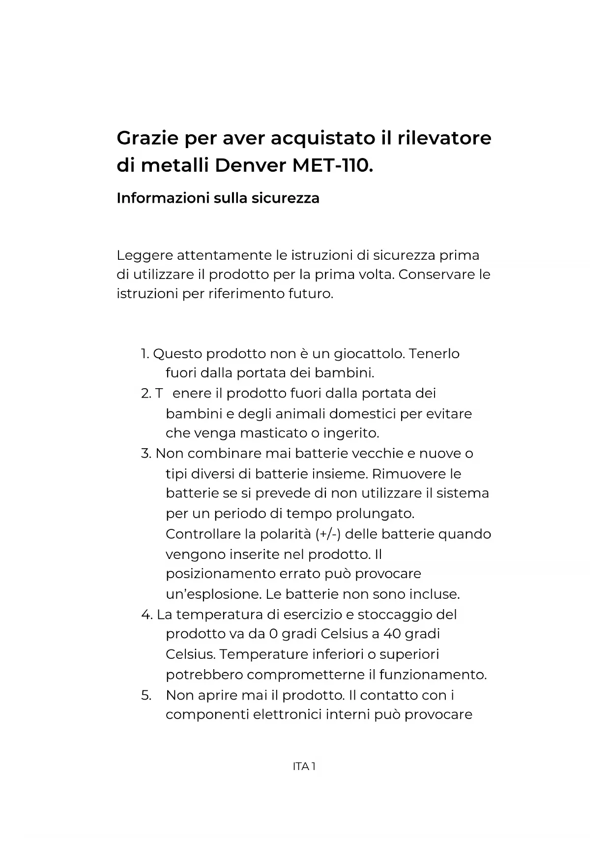 enver A/S Omega 5A, Soeften DK-8382 Hinnerup Dinamarca www.facebook.com/denver.euITA 1 Grazie per aver acquistato il rilevatore di metalli Denver MET-110. Informazioni sulla sicurezza