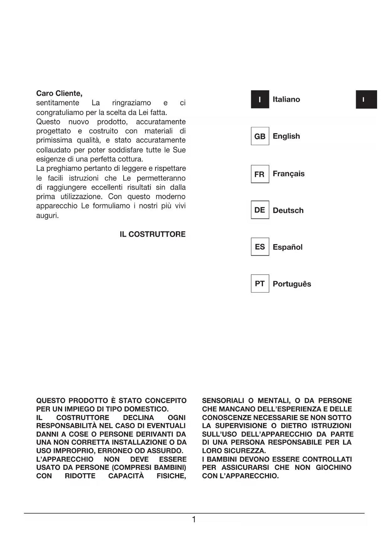 CON L’APPARECCHIO. Caro Cliente, sentitamente La ringraziamo e ci congratuliamo per la scelta da Lei fatta. Questo nuovo prodotto, accuratamente progettato e costruito con materiali di primissima qualità, e stato accuratamente collaudato per poter soddisfare tutte le Sue esigenze di una perfetta cottura. La preghiamo pertanto di leggere e rispettare le facili istruzioni che Le permetteranno di raggiungere eccellenti risultati sin dalla prima utilizzazione. Con questo moderno apparecchio Le formuliamo i nostri più vivi auguri. IL COSTRUTTORE Italiano
