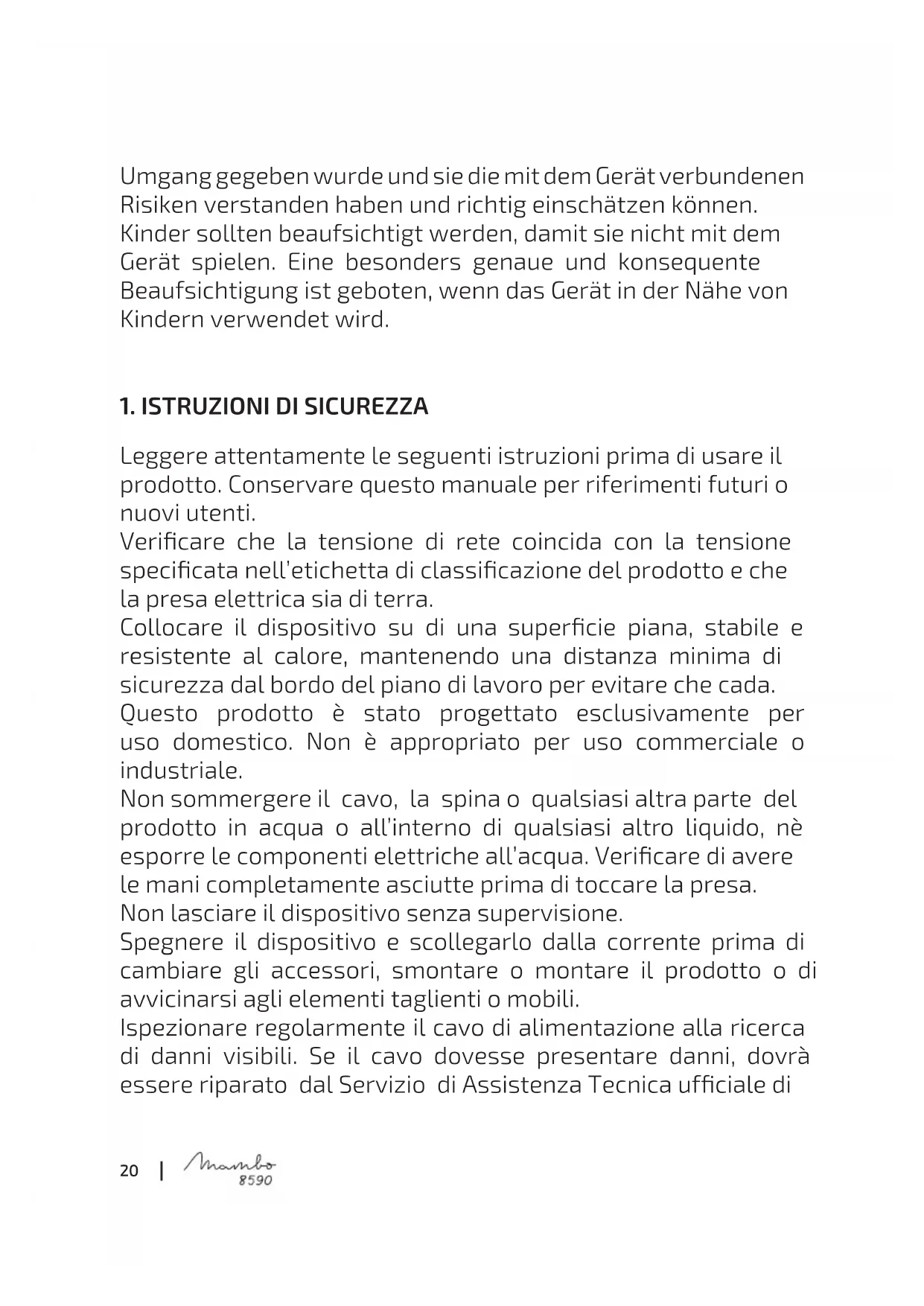 On/Off Utilizzare questo interruttore per accendere e spegnere il prodotto. Inizio/pausa Fig. 20 Premere il selettore della parte frontale del prodotto per attivare il dispositivo. Dal display principale, selezionare la funzione desiderata. Durante il processo di congurazione, mantenere premuto il selettore per 2 secondi per ripristinare tutte le impostazioni. Mentre sta cucinando, premere il selettore per fermarlo e mantenerlo premuto per 2 secondi per riavviare le impostazioni. Dopo 10 minuti di inattività, il dispositivo entrerà in modalità standby. Una volta selezionate le impostazioni o la funzione desiderta, premere il selettore per attivarla e il dispositivo inizierà a funzionare automaticamente. Durante il funzionamento, premere il selettore per mettere in pausa il processo di cottura. Il display mostrerà “PAUSE”. È possibile aprire il coperchio, girare o mescolare gli alimenti, ritirare la caraffa, ecc… Successivamente, collocare di nuovo ogni elemento in posizione corretta e premere di nuovo il selettore per ripristinare il processo. Dopo 10 minuti in pausa, il dispositivo si spegnerà automaticamente. Utilizzare il selettore per congurare tutte le impostazioni: tempo, temperatura, ecc… Girare il selettore in senso orario per aumentare i valori o in senso antiorario per diminuirli. Timer Il display mostrerà il tempo nel seguente formato “ore:minuti:secondi”. Premere una volta il tasto del timer, le cifre dei minuti lampeggeranno. Girare il selettore a sinistra o destra per congurare i minuti desiderati. Premere di nuovo per cambiare la congurazione dei secondi, le cifre dei secondi lampeggeranno. Premere di nuovo per cambiare l’ora. Girare il selettore a sinistra o destra per congurare l’ora desiderata. Durante il funzionamento premere il tasto del timer e il dispositivo comincerà ad effettuare automaticamente il conto alla rovescia.89 ITALIANO Se il timer non è stato congurato, il prodotto funzionerà con i tempi predeniti. Scaldare (senza sbattere): massimo 12 ore. Sbattere (velocità 1-4): massimo 1 ora. Sbattere (velocità 5-10): massimo 5 minuti. Velocità Premere questo tasto per accedere alla congurazione della velocità. L’icona della velocità lampeggerà sul display. Girare il selettore a sinistra e destra per diminuire e aumentare il livello della velocità, da 1 a 10. Se la velocità congurata da 5 a 10, il timer potrà essere solamente congurato no a 5 minuti. Per il resto delle opzioni della velocità, 1 ora. Avvertenza: al cambiare la velocità da 5 a 6 al momento di accendere il dispositivo, questo produrrà rumore. Ciò è completamente normale e non implica un mal funzionamento del prodotto. Per sminuzzare o tagliare a pezzi alimenti duri o grandi quantità di cibo, selezionare inizialmente la velocità 5 per poi cambiare a velocità 10 per garantire alte prestazioni. Temperatura Premere questo tasto per accedere alla congurazione della temperatura. L’icona della temperatura lampeggerà sul display. Girare il selettore verso sinistra per diminuire e aumentare la temperatura da 37 a 120 ºC. Questo valore lampeggerà no a che il robot raggiunga la temperatura la selezionata. L’icona della temperatura si illuminerà in rosso quando la caraffa raggiunge temperature molto alte, come segnale di rischio di scottature. Se l’icona della temperatura è illuminata di rosso e si desidera utilizzare la macchina ad una velocità alta, introdurre meno di 1,5 litri di alimenti. Potenza di calore Premere questo tasto per accedere alla congurazione della potenza di calore. L’icona della potenza di calore lampeggerà sul display. Girare il selettore verso sinistra per diminuire e destra per aumentare la temperatura da 1 a 10. Si consiglia di selezionare una potenza di calore bassa per cucinare alimenti grassi o piccole quantità di cibo evitando che si brucino. Ciò richiede un controllo della temperatura preciso. Gli alimenti vengono cucinati più rapidamente con una potenza di calore alta. La funzione della potenza di calore non si attiverà a meno che la temperatura non venga precedentemente congurata. Si consiglia di usare le ie impostazioni predenite per ogni livello di temperatura. Bilancia Mambo 8590 è dotato di una bilancia incorporata. Pesa no a un massimo di 4.999 grammi, a intervalli di 1 grammo.90 ITALIANO Per attivare la bilancia, il robot deve essere in modalità pausa. Premere il simbolo della bilancia e il display mostrerà “0 00 0” per difetto, indicando che è stato attivato. Quando si introducono ingredienti nella caraffa, il display mostrerà il peso esatto. Se sono già presenti alimenti all’interno della caraffa e si aggiungono altri, la bilancia farà la somma del peso totale indicandola sul display. Se, al contrario, si desidera ritirare ingredienti dall’interno della caraffa, la bilancia sottrarrà il peso e mostrerà il totale. È possibile che il display mostri un valore negativo quando si ritirano gli ingredienti. Funzione tara Se si desidera impostare a zero la bilancia dopo aver introdotto una quantità di ingredienti nella caraffa, premere il simbolo della bilancia. Il display mostrerà di nuovo “0 00 0” e il robot sarà pronto a pesare altri alimenti. Per terminare di pesare e tornare alla modalità pausa, premere qualsiasi simbolo del robot. Il display mostrerà i parametri congurati in precedenza. Turbo Dopo la modalità pause, premere questo tasto per fare sì che il dispositivo funzioni a massima velocità. Il dispositivo mostrerà TURBO lampeggiando. Rilasciare il tasto per fermare il funzionamento del dispositivo sotto questa modalità. Il robot si fermerà automaticamente. Questa funzione può essere utilizzata per un massimo di 1 minuto ogni volta. Avvertenza: quando si attiva la modalità “TURBO”, è possibile che il dispositivo emetta rumori. Ciò è completamente normale e non implica un mal funzionamento del prodotto. Funzioni Tagliare a pezzi: taglia qualsiasi ingrediente dalla carn