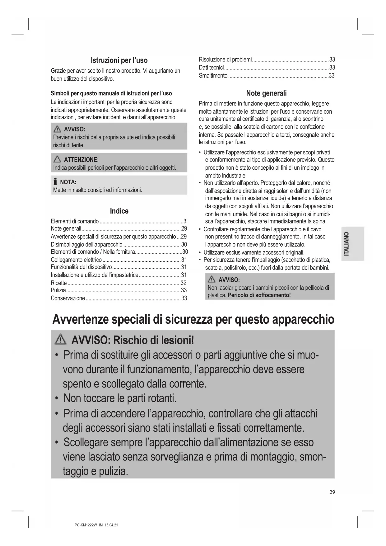 - Conservare sempre l’apparecchio fuori dalla portata dei bambini ed in un luogo asciutto e ben ventilato. Risoluzione di problemi Problema Causa possibile Soluzione L’apparecchio non può essere acceso o smette di funzionare. Dispositivo senza alimentazione di corrente. Controllare la presa con un altro apparecchio. Il braccio rotante non è bloccato nella posizione più bassa. Un interruttore di sicurezza impedisce l’utilizzo. - Verificare che il braccio girevole stia in posizione corretta. - Impostare la manopola in posizione 0. Poi selezionare l’impostazione di velocità desiderata. È scattata la termica. Motore troppo caldo. Lasciar raffreddare il dispositivo per almeno 15 minuti prima di accenderlo di nuovo. L’apparecchio è difettoso. Contattare il centro assistenza e un tecnico. Dati tecnici Modello: ......................................................... PC-KM 1222 W Alimentazione rete: ............................220 – 240 V~, 50 – 60 Hz Consumo di energia: ................................................... 1200 W Classe di protezione: ........................................................... Peso netto: ...............................................................ca. 4,5 kg Si riserva il diritto di apportare modiche tecniche e di design nel corso dello sviluppo del prodotto. Questo dispositivo risponde a tutte le direttive della CE, come la direttiva sulla compatibilità elettromagnetica e quella sul basso voltaggio ed è prodotto secondo le più recenti norme di sicurezza. Smaltimento Significato del simbolo “Eliminazione” Salvaguardare l’ambiente, gli elettrodomestici non vanno eliminati come riuti domestici. Per l’eliminazione degli elettrodomestici, fare uso dei posti di raccolta previsti per questo tipo e porre quegli elettrodomestici che non sono più in uso.PC-KM1222W_IM 16.04.21