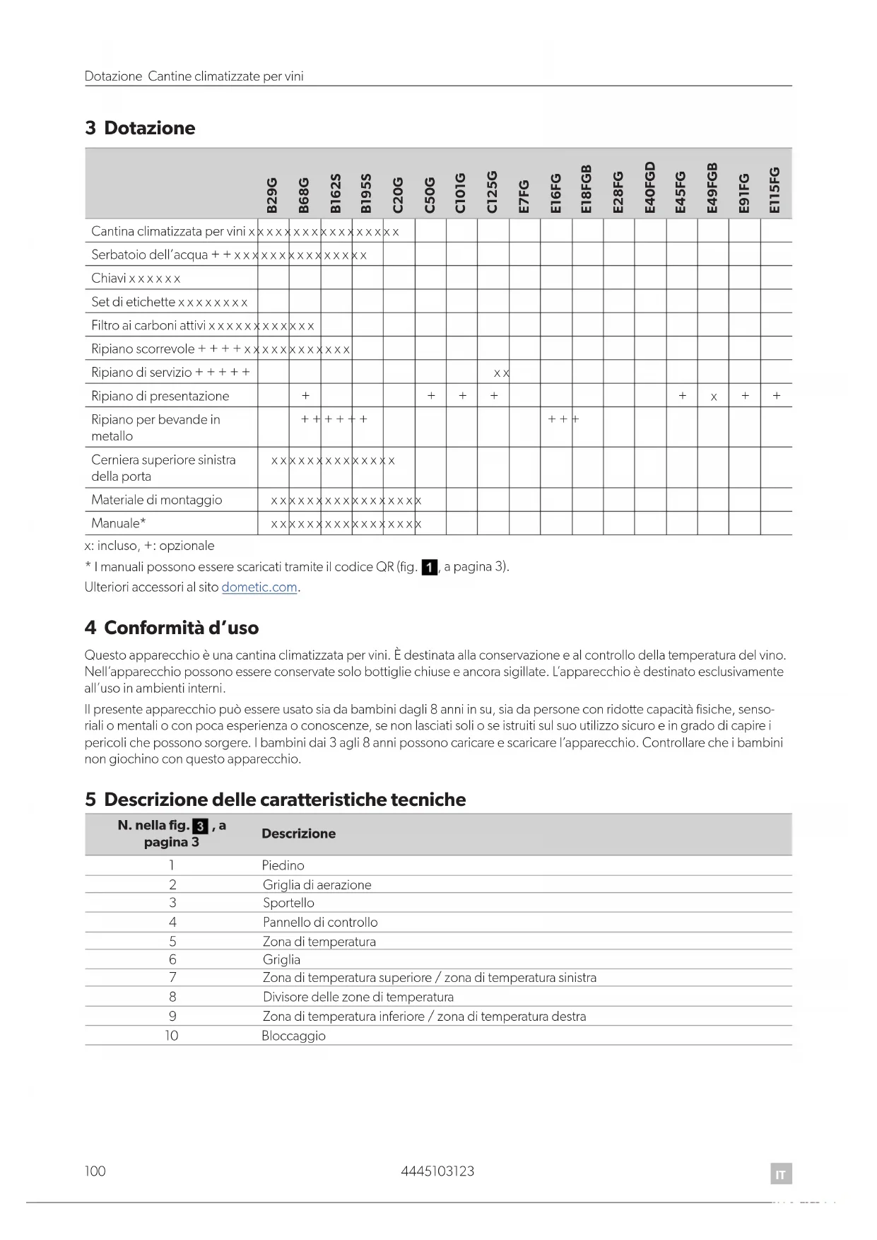 3 Dotazione B29G B68G B162S B195S C20G C50G C101G C125G E7FG E16FG E18FGB E28FG E40FGD E45FG E49FGB E91FG E115FG Cantina climatizzata per vini x x x x x x x x x x x x x x x x x Serbatoio dell’acqua + + x x x x x x x x x x x x x x x Chiavi x x x x x x Set di etichette x x x x x x x x Filtro ai carboni attivi x x x x x x x x x x x x Ripiano scorrevole + + + + x x x x x x x x x x x x Ripiano di servizio + + + + + x x Ripiano di presentazione + + + + + x + + Ripiano per bevande in metallo + + + + + + + + + Cerniera superiore sinistra della porta x x x x x x x x x x x x x x Materiale di montaggio x x x x x x x x x x x x x x x x x Manuale* x x x x x x x x x x x x x x x x x x: incluso, +: opzionale *ImanualipossonoesserescaricatitramiteilcodiceQR(g. , a pagina 3). Ulteriori accessori al sito dometic.com. 4 Conformità d’uso Questo apparecchio è una cantina climatizzata per vini. È destinata alla conservazione e al controllo della temperatura del vino. Nell’apparecchio possono essere conservate solo bottiglie chiuse e ancora sigillate. L’apparecchio è destinato esclusivamente all’uso in ambienti interni. Ilpresenteapparecchiopuòessereusatosiadabambinidagli8anniinsu,siadapersoneconridottecapacitàsiche,senso- riali o mentali o con poca esperienza o conoscenze, se non lasciati soli o se istruiti sul suo utilizzo sicuro e in grado di capire i pericolichepossonosorgere.Ibambinidai3agli8annipossonocaricareescaricarel’apparecchio.Controllarecheibambini non giochino con questo apparecchio. 5 Descrizione delle caratteristiche tecniche N. nella fig. , a pagina 3 Descrizione 1 Piedino 2 Griglia di aerazione 3 Sportello 4 Pannello di controllo 5 Zona di temperatura 6 Griglia 7 Zona di temperatura superiore / zona di temperatura sinistra 8 Divisore delle zone di temperatura 9 Zona di temperatura inferiore / zona di temperatura destra 10 Bloccaggio4445103123 101 Cantine climatizzate per vini Descrizione delle caratteristiche tecniche