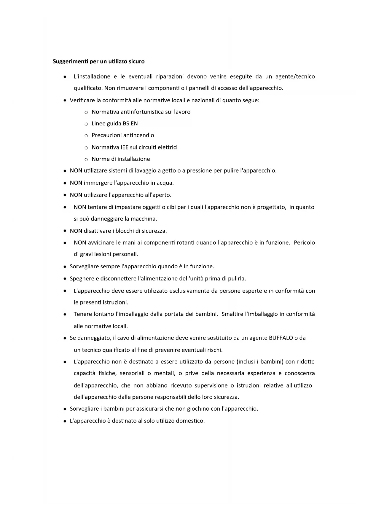 - L'installazione e le eventuali riparazioni devono venire eseguite da un agente/technico qualificato. Non rimuovere i componenti o i pannelli di accesso dell'apparecchio. - Verificare la conformità alle normative locali e nazionali di quanto segue: O Normativa antinfortunistica sul lavoro Linee guida BS EN Precauzioni antincendio O Normativa IEE sui circuiti elettrici O Norme di installmente - NON utilizzato sistemi di lavaggio a getto o a pressione per pulire l'apparecchio. - NON immerge l'apparecchio in acqua. - NON utilizes l'apparecchio all'aperto. - NON tentare di impastare oggetti o cibi per i quali l'apparecchio non è progettato, in quanto si può danneggiare la macchina. - NON disattivare i blocchi di sicurezza. - NON avvincare le mani ai componenti rotanti quando l'apparecchio è in funzione. Pericolodi gravi lesioni personali. - Sorvegliare sempre l'apparecchio quando è in funzione. - Specnere e disconnettere l'alimentazione dell'unità prima di pulirla. - L'apparecchio deve essere utilizzato esclusivamente da persona esperte e in conformità con le presenti istruzioni. - Tenere lontano l'imballaggio alla portata dei bambini. Smaltire l'imballaggio in conformità alle normative locali. - Se danneggiato, il cavo di alimentazione deve venire sostituito da un agente BUFFALO o da un technician qualificato al fine di prevenire eventuali rischi. - L'apparecchio non è destinato a essere utilizzato da persona (inclusi i bambini) con ridotte capacità fisiche, sensoriali o mentali, o prive della necessaria esperienza e conoscenza dell'apparecchio, che non abbiano ricevuto supervisione o istruzioni relative all'utilizzo dell'apparecchio dalle persone responsabili dello loro sicurezza. - Sorvegliare i bambini per assicurarsi che non giochino con l'apparecchio. - L'apparecchio è destinato al solo utilizzato domestico.Descrizione del prodotto