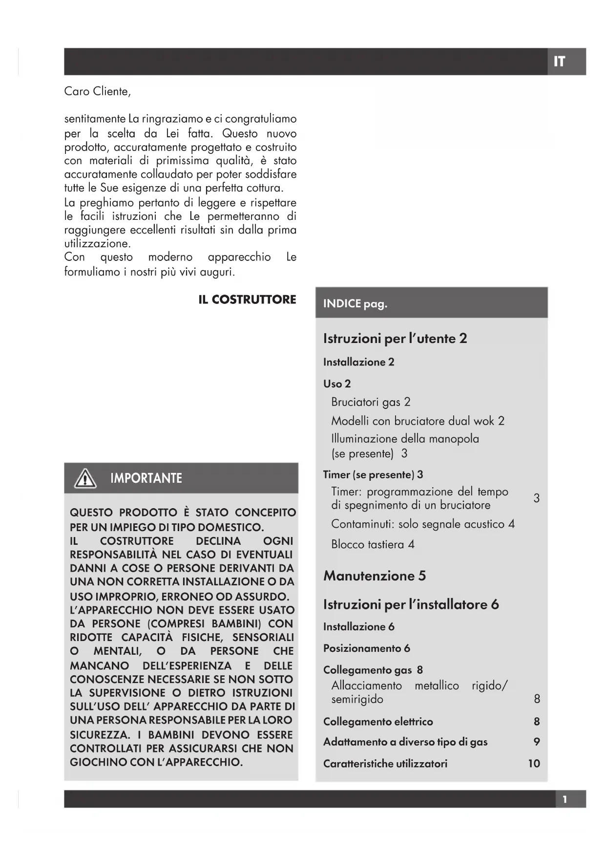 GIOCHINO CON L’APPARECCHIO. INDICE pag. Istruzioni per l’utente 2 Installazione 2 Uso 2 Bruciatori gas 2 Modelli con bruciatore dual wok 2 Illuminazione della manopola (se presente) 3 Timer (se presente) 3 Timer: programmazione del tempo di spegnimento di un bruciatore
