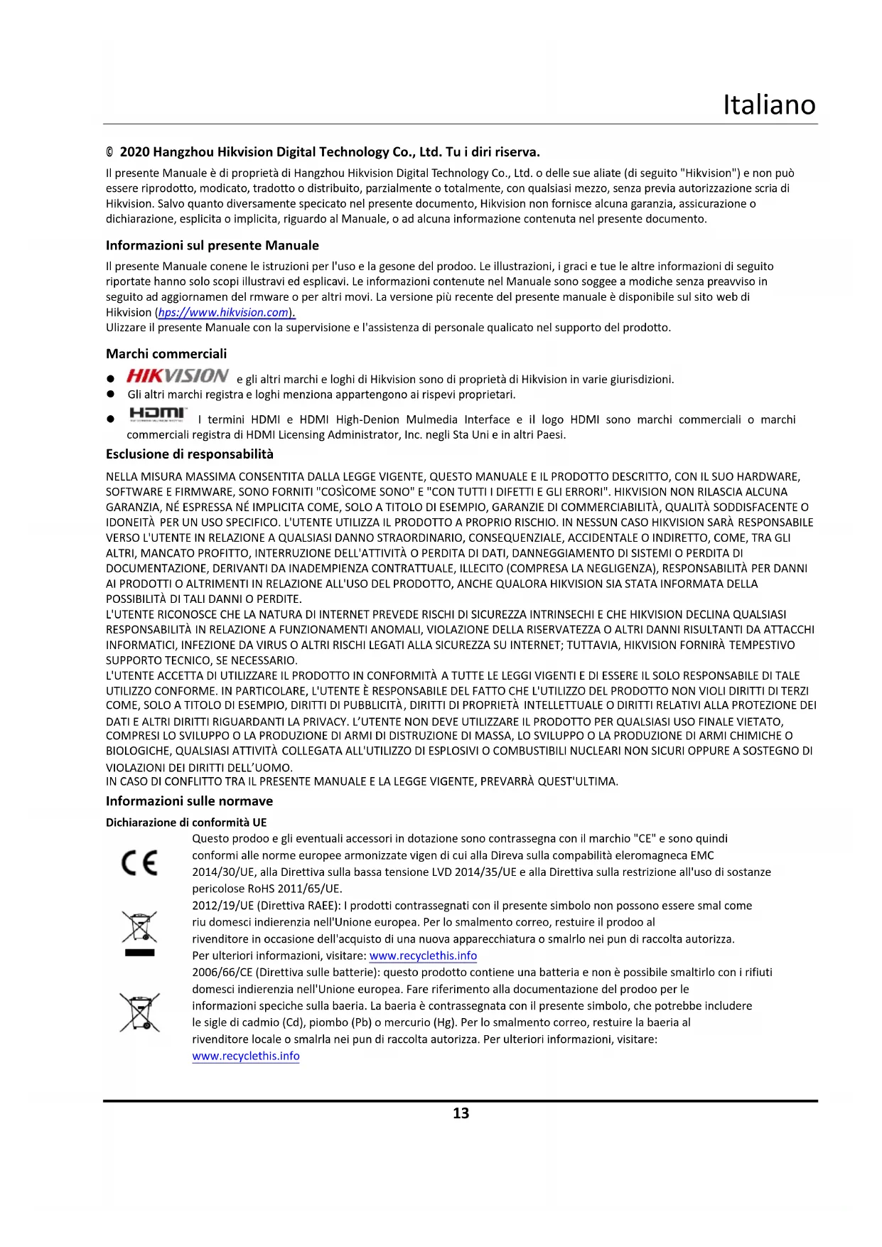 © 2020 Hangzhou Hikvision Digital Technology Co., Ltd. Tutti i diritti riservati. Il presente Manuale è di proprietà di Hangzhou Hikvision Digital Technology Co., Ltd. o delle sue affiliate (di seguito "Hikvision") e non può essere riprodotto, modificato, tradotto o distribuito, parzialmente o totalmente, con qualsiasi mezzo, senza previa autorizzazione scritta di Hikvision. Salvo quanto diversamente specificato nel presente documento, Hikvision non fornisce alcuna garanzia, assicurazione o dichiarazione, esplicita o implicita, riguardo al Manuale, o ad alcuna informazione contenuta nel presente documento. Informazioni sul presente Manuale Il presente Manuale contiene le istruzioni per l'uso e la gestione del prodotto. Le illustrazioni, i grafici e tutte le altre informazioni di seguito riportate hanno solo scopi illustrativi ed esplicativi. Le informazioni contenute nel Manuale sono soggette a modifiche senza preavviso in seguito ad aggiornamenti del firmware o per altri motivi. La versione più recente del presente manuale è disponibile sul sito web di Hikvision (http s://www.hikvision.com). Utilizzare il presente Manuale con la supervisione e l'assistenza di personale qualificato nel supporto del prodotto. Marchi commerciali e gli altri marchi e loghi di Hikvision sono di proprietà di Hikvision in varie giurisdizioni. Gli altri marchi registrati e loghi menzionati appartengono ai rispettivi proprietari. I termini HDMI e HDMI High-Definition Multimedia Interface e il logo HDMI sono marchi commerciali o marchi commerciali registrati di HDMI Licensing Administrator, Inc. negli Stati Uniti e in altri Paesi. Esclusione di responsabilità NELLA MISURA MASSIMA CONSENTITA DALLA LEGGE VIGENTE, QUESTO MANUALE E IL PRODOTTO DESCRITTO, CON IL SUO HARDWARE, SOFTWARE E FIRMWARE, SONO FORNITI "COSÌ COME SONO" E "CON TUTTI I DIFETTI E GLI ERRORI". HIKVISION NON RILASCIA ALCUNA GARANZIA, NÉ ESPRESSA NÉ IMPLICITA COME, SOLO A TITOLO DI ESEMPIO, GARANZIE DI COMMERCIABILITÀ, QUALITÀ SODDISFACENTE O IDONEITÀ PER UN USO SPECIFICO. L'UTENTE UTILIZZA IL PRODOTTO A PROPRIO RISCHIO. IN NESSUN CASO HIKVISION SARÀ RESPONSABILE VERSO L'UTENTE IN RELAZIONE A QUALSIASI DANNO STRAORDINARIO, CONSEQUENZIALE, ACCIDENTALE O INDIRETTO, COME, TRA GLI ALTRI, MANCATO PROFITTO, INTERRUZIONE DELL'ATTIVITÀ O PERDITA DI DATI, DANNEGGIAMENTO DI SISTEMI O PERDITA DI DOCUMENTAZIONE, DERIVANTI DA INADEMPIENZA CONTRATTUALE, ILLECITO (COMPRESA LA NEGLIGENZA), RESPONSABILITÀ PER DANNI AI PRODOTTI O ALTRIMENTI IN RELAZIONE ALL'USO DEL PRODOTTO, ANCHE QUALORA HIKVISION SIA STATA INFORMATA DELLA POSSIBILITÀ DI TALI DANNI O PERDITE. L'UTENTE RICONOSCE CHE LA NATURA DI INTERNET PREVEDE RISCHI DI SICUREZZA INTRINSECHI E CHE HIKVISION DECLINA QUALSIASI RESPONSABILITÀ IN RELAZIONE A FUNZIONAMENTI ANOMALI, VIOLAZIONE DELLA RISERVATEZZA O ALTRI DANNI RISULTANTI DA ATTACCHI INFORMATICI, INFEZIONE DA VIRUS O ALTRI RISCHI LEGATI ALLA SICUREZZA SU INTERNET; TUTTAVIA, HIKVISION FORNIRÀ TEMPESTIVO SUPPORTO TECNICO, SE NECESSARIO. L'UTENTE ACCETTA DI UTILIZZARE IL PRODOTTO IN CONFORMITÀ A TUTTE LE LEGGI VIGENTI E DI ESSERE IL SOLO RESPONSABILE DI TALE UTILIZZO CONFORME. IN PARTICOLARE, L'UTENTE È RESPONSABILE DEL FATTO CHE L'UTILIZZO DEL PRODOTTO NON VIOLI DIRITTI DI TERZI COME, SOLO A TITOLO DI ESEMPIO, DIRITTI DI PUBBLICITÀ, DIRITTI DI PROPRIETÀ INTELLETTUALE O DIRITTI RELATIVI ALLA PROTEZIONE DEI DATI E ALTRI DIRITTI RIGUARDANTI LA PRIVACY. L’UTENTE NON DEVE UTILIZZARE IL PRODOTTO PER QUALSIASI USO FINALE VIETATO, COMPRESI LO SVILUPPO O LA PRODUZIONE DI ARMI DI DISTRUZIONE DI MASSA, LO SVILUPPO O LA PRODUZIONE DI ARMI CHIMICHE O BIOLOGICHE, QUALSIASI ATTIVITÀ COLLEGATA ALL'UTILIZZO DI ESPLOSIVI O COMBUSTIBILI NUCLEARI NON SICURI OPPURE A SOSTEGNO DI VIOLAZIONI DEI DIRITTI DELL’UOMO. IN CASO DI CONFLITTO TRA IL PRESENTE MANUALE E LA LEGGE VIGENTE, PREVARRÀ QUEST'ULTIMA. Informazioni sulle normative Dichiarazione di conformità UE