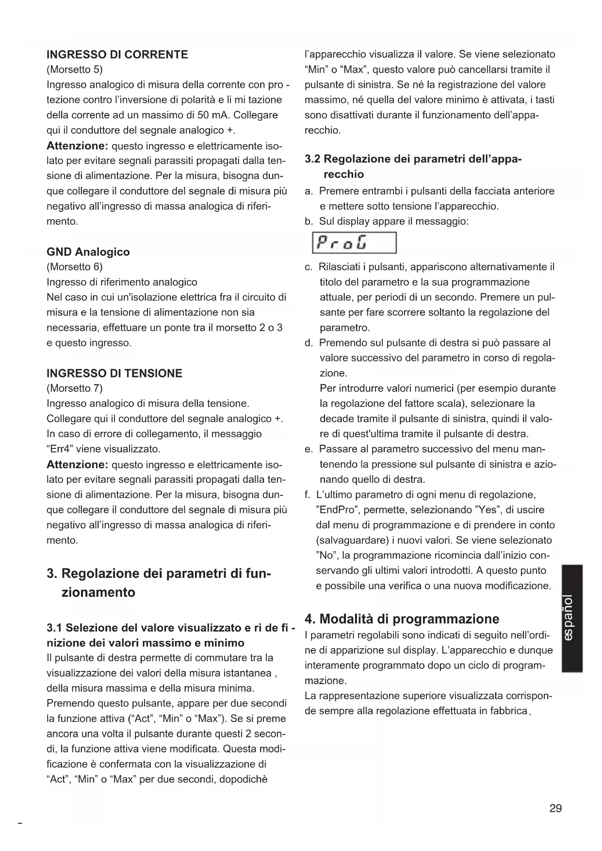 recchio a. Premere entrambi i pulsanti della facciata anteriore e mettere sotto tensione l’apparecchio. b. Sul display appare il messaggio: c. Rilasciati i pulsanti, appariscono alternativamente il titolo del parametro e la sua programmazione attuale, per periodi di un secondo. Premere un pul- sante per fare scorrere soltanto la regolazione del parametro. d. Premendo sul pulsante di destra si può passare al valore successivo del parametro in corso di regola- zione. Per introdurre valori numerici (per esempio durante la regolazione del fattore scala), selezionare la decade tramite il pulsante di sinistra, quindi il valo- re di quest'ultima tramite il pulsante di destra. e. Passare al parametro successivo del menu man- tenendo la pressione sul pulsante di sinistra e azio- nando quello di destra. f. L’ultimo parametro di ogni menu di regolazione, ”EndPro”, permette, selezionando ”Yes”, di uscire dal menu di programmazione e di prendere in conto (salvaguardare) i nuovi valori. Se viene selezionato ”No”, la programmazione ricomincia dall’inizio con- servando gli ultimi valori introdotti. A questo punto e possibile una verifica o una nuova modificazione.