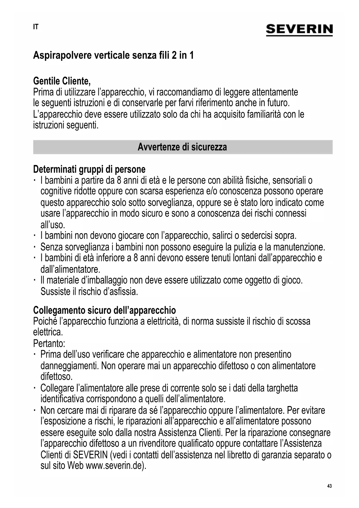 142 x 208 mm CONSEJO: Para la limpieza no deben utilizarse detergentes agresivos ni abrasivos o cepillos duros. Almacenamiento del aparato ∙ Almacene el aparato y los accesorios en un lugar seco y fresco fuera del alcance de los niños. ∙ Para poder guardarlo fácilmente, pulse el botón y pliegue el mango. Referencia Accesorio/pieza de repuesto 9814-048 Juego de ltross 6982-048 Depósito para el polvo con ltro 2361-048 Fuente de alimentación con cable de conexión 3709-048 Boquilla para suelo 3627-048 Cepillo giratorio para la boquilla de suelo 0024-048 Boquilla de succión corta 9812-048 Boquilla de succión larga 9811-048 Cepillo Solución de problemas Cómo solucionar problemas uno mismo Para evitar problemas es importante vaciar el depósito de polvo regularmente y aprovechar la ocasión para revisar los ltros y limpiarlos en función de la suciedad acumulada. Si no obstante tuviese problemas con el aparato, compruebe a partir de la tabla siguiente si puede solucionar el problema por sí mismo. Para buscar los fallos, asegúrese de que el aparato está desconectado y de que no está cargando. Problema Posible causa / Solución El aparato no se enciende. Batería completamente vacía, el LED no se enciende. Apague el aparato y cargue la batería. ►Capítulo «Cargar la batería». El aparato no se carga (las luces LED no parpadean). La fuente de alimentación o el aparato no están bien enchufados. Compruebe si la fuente de alimentación está insertada correctamente en la toma del aspirador de mano. Compruebe si la fuente de alimentación está correctamente colocada en el enchufe. Cuando se esté utilizando la toma de carga de la parte posterior del mango, compruebe si la clavija está correctamente conectada en la toma y si el aspirador de mano está bien encajado. ►Capítulo «Cargar la batería». La batería está cargada pero el aparato apenas aspira la suciedad. Debe vaciarse el depósito para polvo o limpiarse el ltro. ►Capítulo «Limpieza y mantenimiento del aparato» La duración del funcionamiento es cada vez más breve. El cepillo giratorio está sucio y debe limpiarse, ►Capítulo «Limpieza del cepillo giratorio» Debe limpiarse el ltro. ►Capítulo «Limpieza y mantenimiento del aparato» El cepillo cilíndrico gira lentamente o de forma irregular. El cepillo giratorio está sucio y debe limpiarse. ►Capítulo «Limpieza del cepillo giratorio» Si esta tabla no le sirve de ayuda, póngase en contacto con nuestra línea directa de atención al cliente (consulte el folleto de garantía aparate).42 142 x 208 mm Eliminación Los aparatos y las baterías identicados con este símbolo deben eliminarse por separado de la basura doméstica. Estos aparatos y baterías contienen materiales valiosos que pueden reutilizarse. La eliminación correcta de residuos protege el medio ambiente y la salud de los demás. Deposite el aparato y la batería en los puntos de recogida correspondientes para que se eliminen. El organismo local responsable o su distribuidor especializado le proporcionarán información sobre la eliminación adecuada.43 142 x 208 mm Aspirapolvere verticale senza li 2 in 1 Gentile Cliente, Prima di utilizzare l’apparecchio, vi raccomandiamo di leggere attentamente le seguenti istruzioni e di conservarle per farvi riferimento anche in futuro. L’apparecchio deve essere utilizzato solo da chi ha acquisito familiarità con le istruzioni seguenti. Avvertenze di sicurezza Determinati gruppi di persone ∙ I bambini a partire da 8 anni di età e le persone con abilità siche, sensoriali o cognitive ridotte oppure con scarsa esperienza e/o conoscenza possono operare questo apparecchio solo sotto sorveglianza, oppure se è stato loro indicato come usare l’apparecchio in modo sicuro e sono a conoscenza dei rischi connessi all’uso. ∙ I bambini non devono giocare con l’apparecchio, salirci o sedercisi sopra. ∙ Senza sorveglianza i bambini non possono eseguire la pulizia e la manutenzione. ∙ I bambini di età inferiore a 8 anni devono essere tenuti lontani dall’apparecchio e dall’alimentatore. ∙ Il materiale d’imballaggio non deve essere utilizzato come oggetto di gioco. Sussiste il rischio d’asssia. Collegamento sicuro dell’apparecchio Poiché l’apparecchio funziona a elettricità, di norma sussiste il rischio di scossa elettrica. Pertanto: ∙ Prima dell’uso vericare che apparecchio e alimentatore non presentino danneggiamenti. Non operare mai un apparecchio difettoso o con alimentatore difettoso. ∙ Collegare l’alimentatore alle prese di corrente solo se i dati della targhetta identicativa corrispondono a quelli dell’alimentatore. ∙ Non cercare mai di riparare da sé l’apparecchio oppure l’alimentatore. Per evitare l’esposizione a rischi, le riparazioni all’apparecchio e all’alimentatore possono essere eseguite solo dalla nostra Assistenza Clienti. Per la riparazione consegnare l’apparecchio difettoso a un rivenditore qualicato oppure contattare l’Assistenza Clienti di SEVERIN (vedi i contatti dell’assistenza nel libretto di garanzia separato o sul sito Web www.severin.de). IT44 142 x 208 mm ∙ Non immergere l’apparecchio o l’alimentatore in acqua o in altri liquidi, né trattarli con liquidi. Tenere l’apparecchio e l’alimentatore lontani da pioggia e umidità. Non operare l’apparecchio e l’alimentatore all’aperto o in locali ad alto tasso di umidità dell’aria. ∙ Non toccare l’apparecchio e l’alimentatore con le mani bagnate. Nello scollegare l’alimentatore dalla presa di corrente, afferrare sempre direttamente l’alimentatore. ∙ Assicurarsi che il cavo dell’alimentatore non venga piegato, schiacciato o premuto passandoci sopra e che il cavo non vada a contatto con fonti di calore, umidità o spigoli vivi. Assicurarsi che il cavo dell’alimentatore non sia causa di inciampo. ∙ Prima di eseguire la pulizia o la manutenzione dell’apparecchio, nonché prima di cambiare un a
