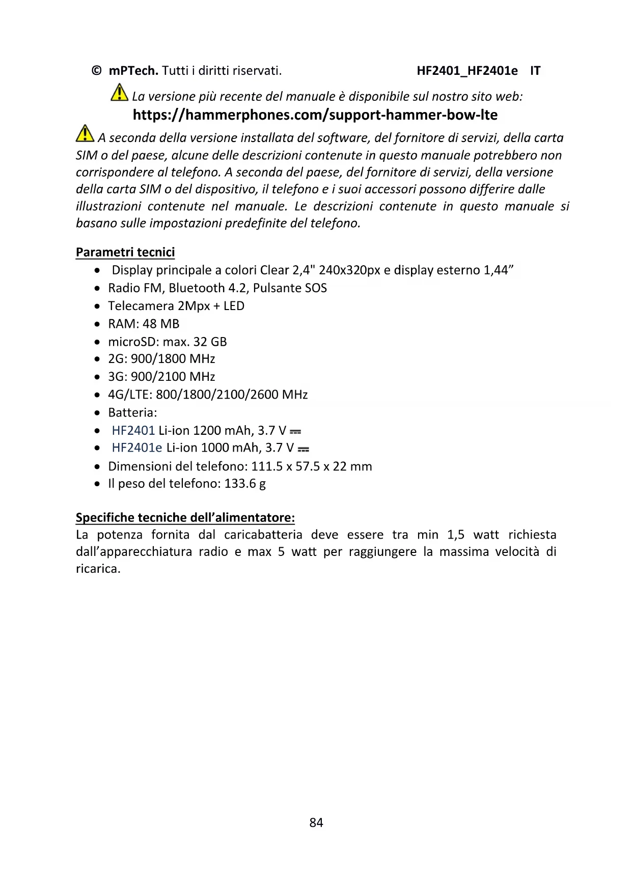 - Il peso del telefono: 133.6 g Specifiche tecniche dell’alimentatore: La potenza fornita dal caricabatteria deve essere tra min 1,5 watt richiesta dall’apparecchiatura radio e max 5 watt per raggiungere la massima velocità di ricarica.© mPTech. Tutti i diritti riservati. HF2401_HF2401e IT