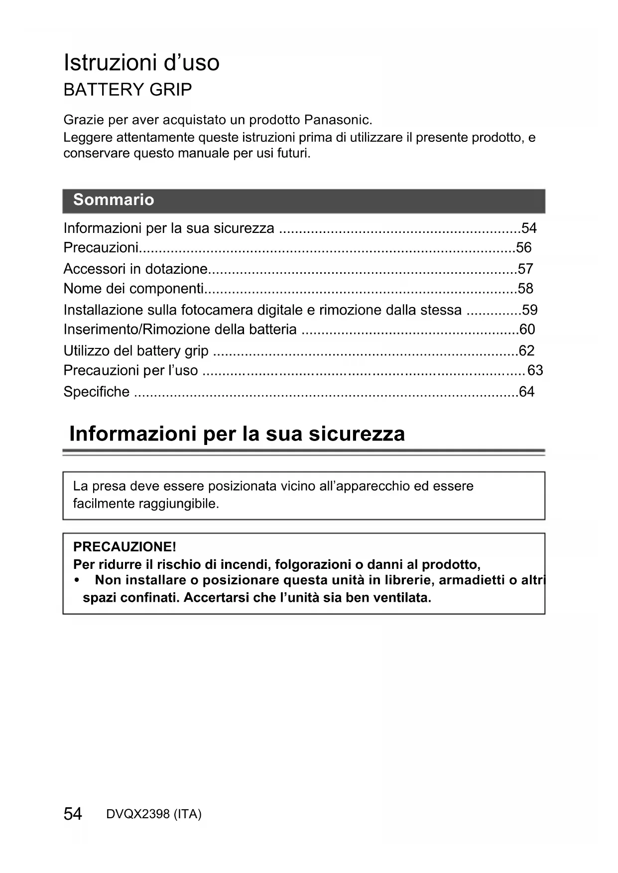 Non scaldare e non esporre alla fiamma. 0 Non lasciare la batteria/le batterie per molto tempo in un’automobile, esposte alla luce solare diretta e con le portiere e i finestrini chiusi. 0 Non esporre a bassa pressione dell'aria ad altitudini elevate. 0 Non esporre a pressione dell'aria estremamente bassa, poiché questo può portare ad esplosioni o perdita di liquidi e gas infiammabili. -Se vedete questo simbolo- PRECAUZIONE 0 Se la batteria viene sostituita in modo non corretto esiste il pericolo di esplosione. Sostituire solo con il tipo raccomandato dal produttore. 0 Quando si smaltiscono le batterie, contattare le autorità locali o il rivenditore e chiedere informazioni sul metodo corretto di smaltimento. Attenzione Rischio di incendi, esplosioni e ustioni. Non smontare le batterie, non riscaldarle oltre i 60 oC e non incenerirle. Smaltimento di vecchie apparecchiature e batterie usate Solo per Unione Europea e Nazioni con sistemi di raccolta e smaltimento Questi simboli sui prodotti, sull’imballaggio e/o sulle documentazioni o manuali accompagnanti i prodotti indicano che i prodotti elettrici, elettronici e le batterie usate non devono essere smaltiti come rifiuti urbani ma deve essere effettuata una raccolta separata. Per un trattamento adeguato, recupero e riciclaggio di vecchi prodotti e batterie usate vi invitiamo a consegnarli agli appositi punti di raccolta secondo la legislazione vigente nel vostro paese. Con uno smaltimento corretto, contribuirete a salvare importanti risorse e ad evitare i potenziali effetti negativi sulla salute umana e sull’ambiente. Per ulteriori informazioni su raccolta e riciclaggio, vi invitiamo a contattare il vostro comune. Lo smaltimento non corretto di questi rifiuti potrebbe comportare sanzioni in accordo con la legislazione nazionale. Note per il simbolo batterie (simbolo sotto): Questo simbolo può essere usato in combinazione con un simbolo chimico. In questo caso è conforme ai requisiti indicati dalla Direttiva per il prodotto chimico in questione. DMW-BG1-DVQX2398.book 55 ページ 2023年8月24日 木曜日 午後3時18分56 DVQX2398 (ITA) Precauzioni 0 Questa unità è un battery grip per fotocamera digitali Panasonic. La facilità di utilizzo e di presa migliorano quando l'unità è in posizione verticale durante la registrazione. Il gruppo batterie