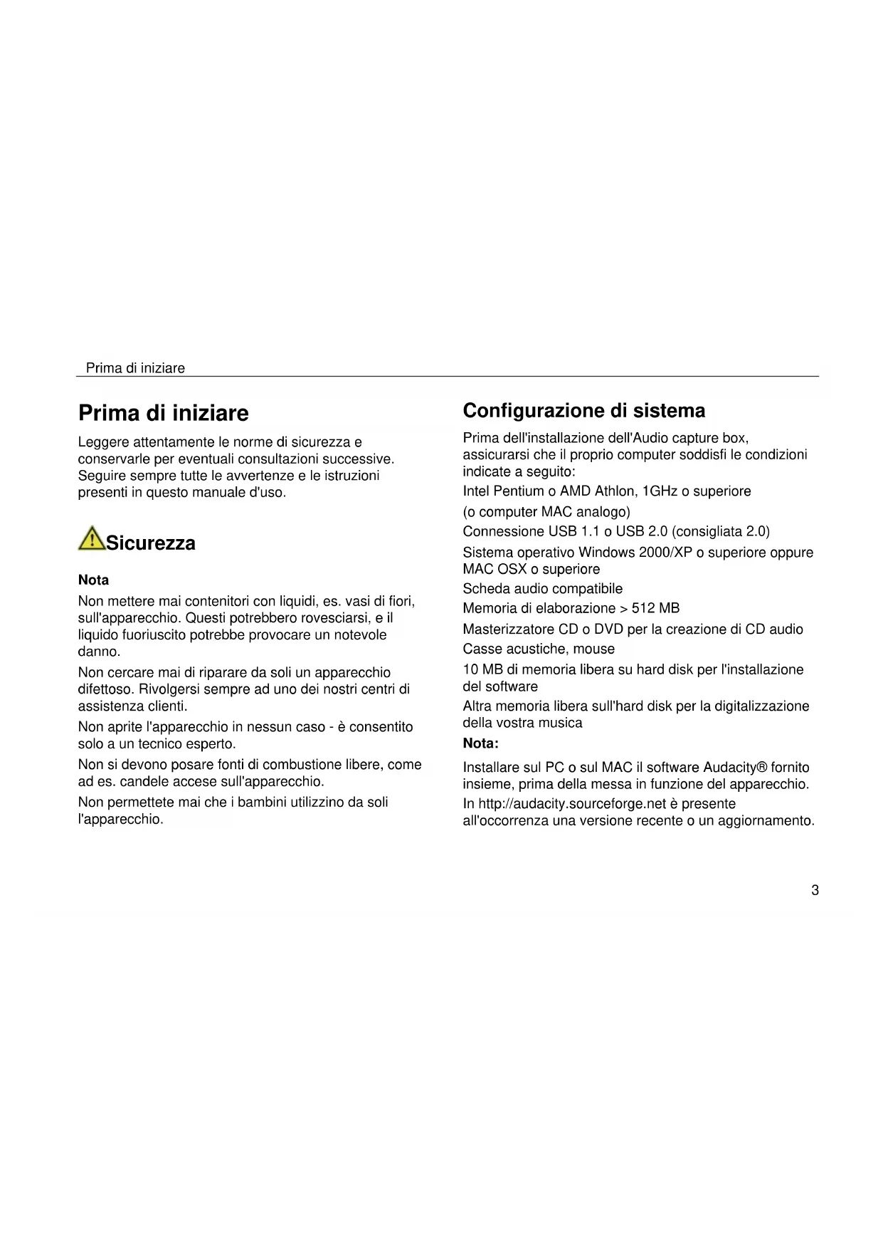 Prima di iniziare Leggere attentamente le norme di sicurezza e conservarle per eventuali consultazioni successive. Seguire sempre tutte le avvertenze e le istruzioni presenti in questo manuale d'uso. Sicurezza Nota Non mettere mai contenitori con liquidi, es. vasi di fiori, sull'apparecchio. Questi potrebbero rovesciarsi, e il liquido fuoriuscito potrebbe provocare un notevole danno. Non cercare mai di riparare da soli un apparecchio difettoso. Rivolgersi sempre ad uno dei nostri centri di assistenza clienti. Non aprite l'apparecchio in nessun caso - è consentito solo a un tecnico esperto. Non si devono posare fonti di combustione libere, come ad es. candele accese sull'apparecchio. Non permettete mai che i bambini utilizzino da soli l'apparecchio. Configurazione di sistema Prima dell'installazione dell'Audio capture box, assicurarsi che il proprio computer soddisfi le condizioni indicate a seguito: Intel Pentium o AMD Athlon, 1GHz o superiore (o computer MAC analogo) Connessione USB 1.1 o USB 2.0 (consigliata 2.0) Sistema operativo Windows 2000/XP o superiore oppure MAC OSX o superiore Scheda audio compatibile Memoria di elaborazione > 512 MB Masterizzatore CD o DVD per la creazione di CD audio Casse acustiche, mouse 10 MB di memoria libera su hard disk per l'installazione del software Altra memoria libera sull'hard disk per la digitalizzazione della vostra musica Nota: Installare sul PC o sul MAC il software Audacity® fornito insieme, prima della messa in funzione del apparecchio. In http://audacity.sourceforge.net è presente all'occorrenza una versione recente o un aggiornamento.Descrizione dell'apparecchio