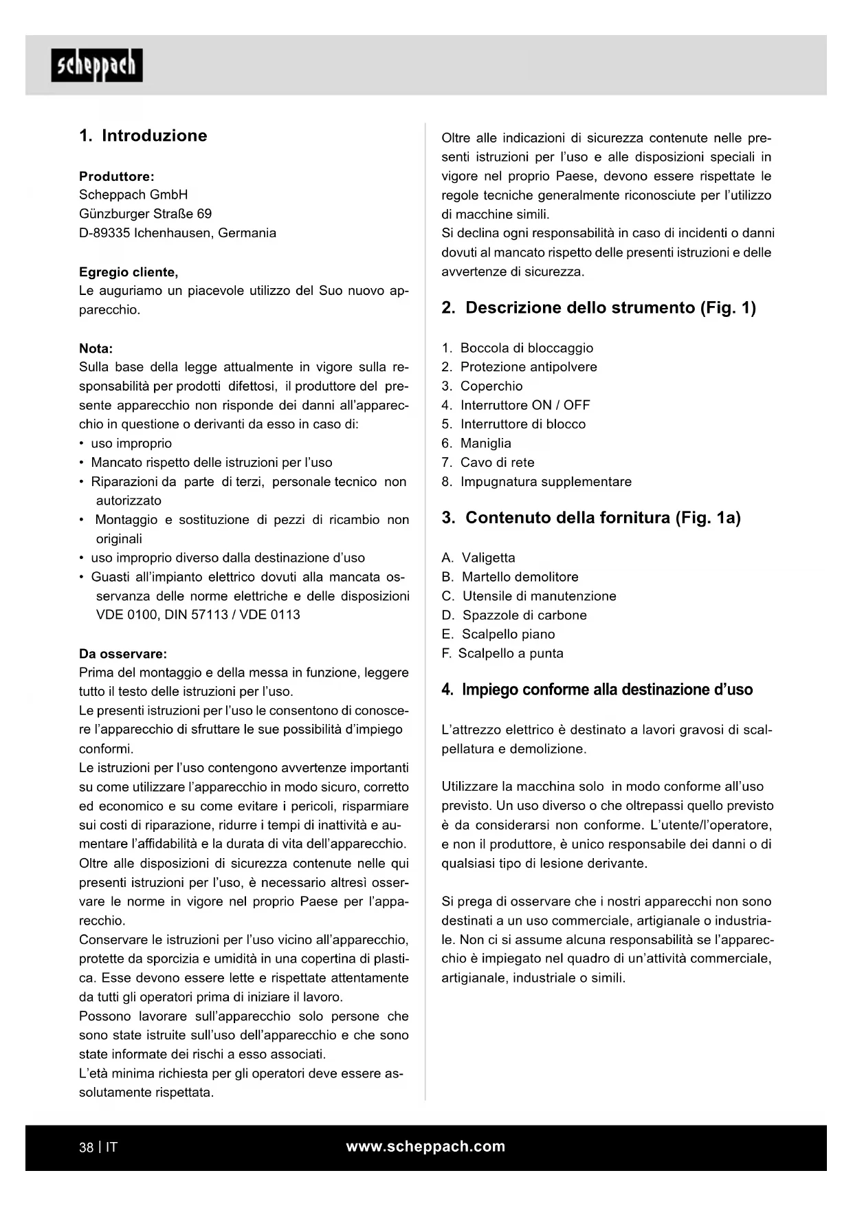 Produttore: Scheppach GmbH Günzburger Straße 69 D-89335 Ichenhausen, Germania Egregio cliente, Le auguriamo un piacevole utilizzo del Suo nuovo ap- parecchio. Nota: Sulla base della legge attualmente in vigore sulla re- sponsabilità per prodotti difettosi, il produttore del pre- sente apparecchio non risponde dei danni all’apparec- chio in questione o derivanti da esso in caso di: