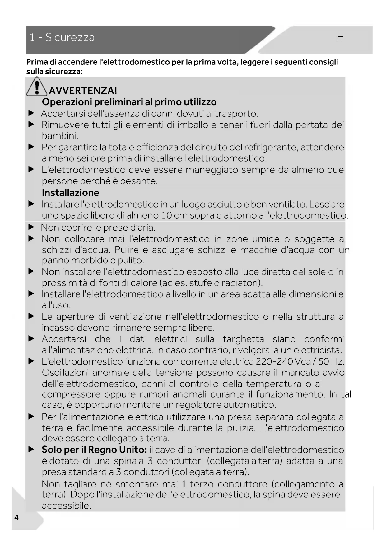 - Non tagliare né smontare mai il terzo conduttore (collegamento a terra). Dopo l'installazione dell'elettrodomestico, la spina deve essere accessibile.1 - Sicurezza