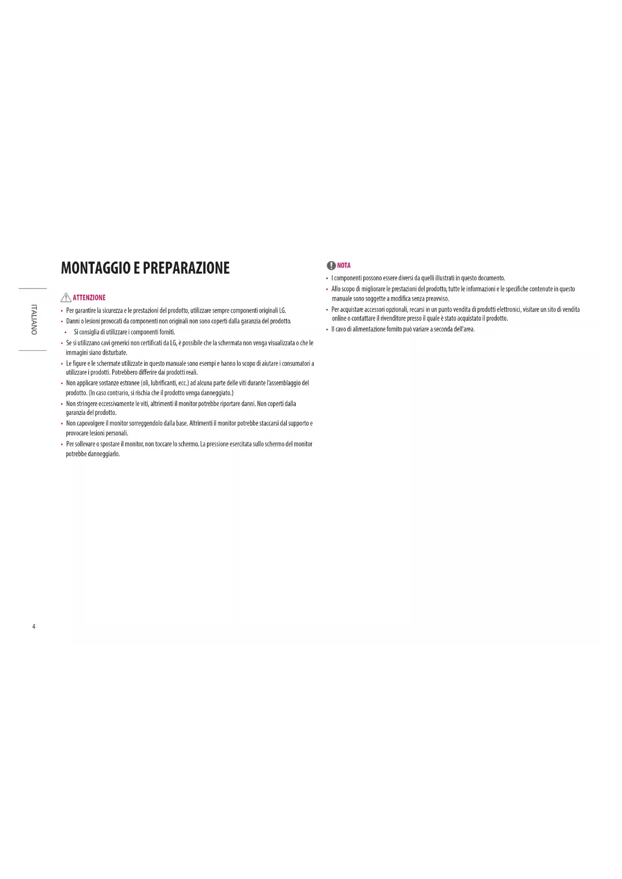 - Per garantire la sicurezza e le prestazioni del prodotto, utilizzare sempre componenti originali LG.