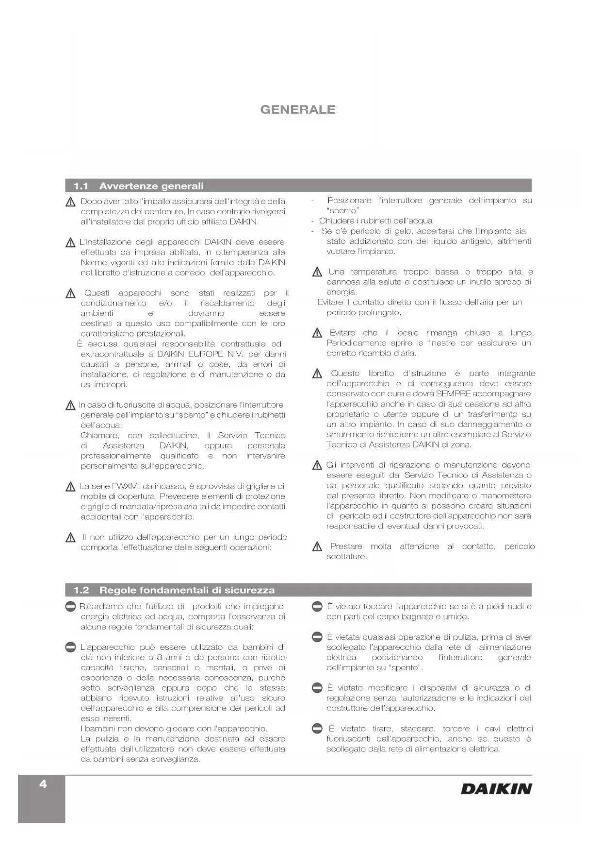 Avvertenze generali Regole fondamentali di sicurezza Dopo aver tolto l’imballo assicurarsi dell'integrità e della completezza del contenuto. In caso contrario rivolgersi all'installatore del proprio ufficio affiliato DAIKIN. L’installazione degli apparecchi DAIKIN deve essere effettuata da impresa abilitata, in ottemperanza alle Norme vigenti ed alle indicazioni fornite dalla DAIKIN nel libretto d’istruzione a corredo dell’apparecchio. Questi apparecchi sono stati realizzati per il condizionamento e/o il riscaldamento degli ambienti e dovranno essere destinati a questo uso compatibilmente con le loro caratteristiche prestazionali. È esclusa qualsiasi responsabilità contrattuale ed extracontrattuale a DAIKIN EUROPE N.V. per danni causati a persone, animali o cose, da errori di installazione, di regolazione e di manutenzione o da usi impropri. In caso di fuoriuscite di acqua, posizionare l’interruttore generale dell’impianto su “spento” e chiudere i rubinetti dell’acqua. Chiamare, con sollecitudine, il Servizio Tecnico di Assistenza DAIKIN, oppure personale professionalmente qualificato e non intervenire personalmente sull’apparecchio. La serie FWXM, da incasso, è sprovvista di griglie e di mobile di copertura. Prevedere elementi di protezione e griglie di mandata/ripresa aria tali da impedire contatti accidentali con l’apparecchio. Il non utilizzo dell’apparecchio per un lungo periodo comporta l’effettuazione delle seguenti operazioni: - Posizionare l’interruttore generale dell’impianto su “spento” - Chiudere i rubinetti dell’acqua - Se c’è pericolo di gelo, accertarsi che l’impianto sia stato addizionato con del liquido antigelo, altrimenti vuotare l’impianto. Una temperatura troppo bassa o troppo alta è dannosa alla salute e costituisce un inutile spreco di energia. Evitare il contatto diretto con il flusso dell’aria per un periodo prolungato. Evitare che il locale rimanga chiuso a lungo. Periodicamente aprire le finestre per assicurare un corretto ricambio d’aria. Questo libretto d’istruzione è parte integrante dell’apparecchio e di conseguenza deve essere conservato con cura e dovrà SEMPRE accompagnare l’apparecchio anche in caso di sua cessione ad altro proprietario o utente oppure di un trasferimento su un altro impianto. In caso di suo danneggiamento o smarrimento richiederne un altro esemplare al Servizio Tecnico di Assistenza DAIKIN di zona. Gli interventi di riparazione o manutenzione devono essere eseguiti dal Servizio Tecnico di Assistenza o da personale qualificato secondo quanto previsto dal presente libretto. Non modificare o manomettere l’apparecchio in quanto si possono creare situazioni di pericolo ed il costruttore dell’apparecchio non sarà responsabile di eventuali danni provocati. Prestare molta attenzione al contatto, pericolo scottature. Ricordiamo che l’utilizzo di prodotti che impiegano energia elettrica ed acqua, comporta l’osservanza di alcune regole fondamentali di sicurezza quali: L'apparecchio può essere utilizzato da bambini di età non inferiore a 8 anni e da persone con ridotte capacità fisiche, sensoriali o mentali, o prive di esperienza o della necessaria conoscenza, purché sotto sorveglianza oppure dopo che le stesse abbiano ricevuto istruzioni relative all'uso sicuro dell'apparecchio e alla comprensione dei pericoli ad esso inerenti. I bambini non devono giocare con l'apparecchio. La pulizia e la manutenzione destinata ad essere effettuata dall'utilizzatore non deve essere effettuata da bambini senza sorveglianza. È vietato toccare l’apparecchio se si è a piedi nudi e con parti del corpo bagnate o umide. È vietata qualsiasi operazione di pulizia, prima di aver scollegato l’apparecchio dalla rete di alimentazione elettrica posizionando l’interruttore generale dell’impianto su “spento”. È vietato modificare i dispositivi di sicurezza o di regolazione senza l’autorizzazione e le indicazioni del costruttore dell’apparecchio. È vietato tirare, staccare, torcere i cavi elettrici fuoriuscenti dall’apparecchio, anche se questo è scollegato dalla rete di alimentazione elettrica. GENERALE5