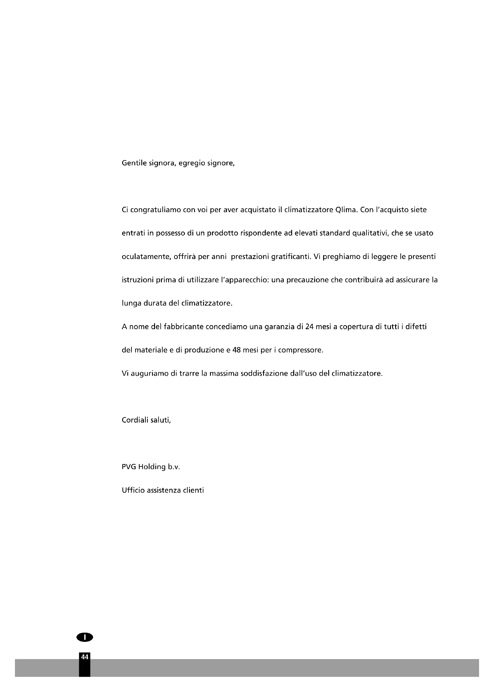 43Gentile signora, egregio signore, CicongratuliamoconvoiperaveracquistatoilclimatizzatoreQlima.Conl’acquistosiete entrati in possesso di un prodotto rispondente ad elevati standard qualitativi, che se usato oculatamente,offriràperanniprestazionigratificanti.Vipreghiamodileggerelepresenti istruzioniprimadiutilizzarel’apparecchio:unaprecauzionechecontribuiràadassicurarela lungaduratadelclimatizzatore. Anomedelfabbricanteconcediamounagaranziadi24mesiacoperturadituttiidifetti delmaterialeediproduzionee48mesipericompressore. Viauguriamoditrarrelamassimasoddisfazionedall’usodelclimatizzatore. Cordiali saluti, PVG Holding b.v. Ufficioassistenzaclienti