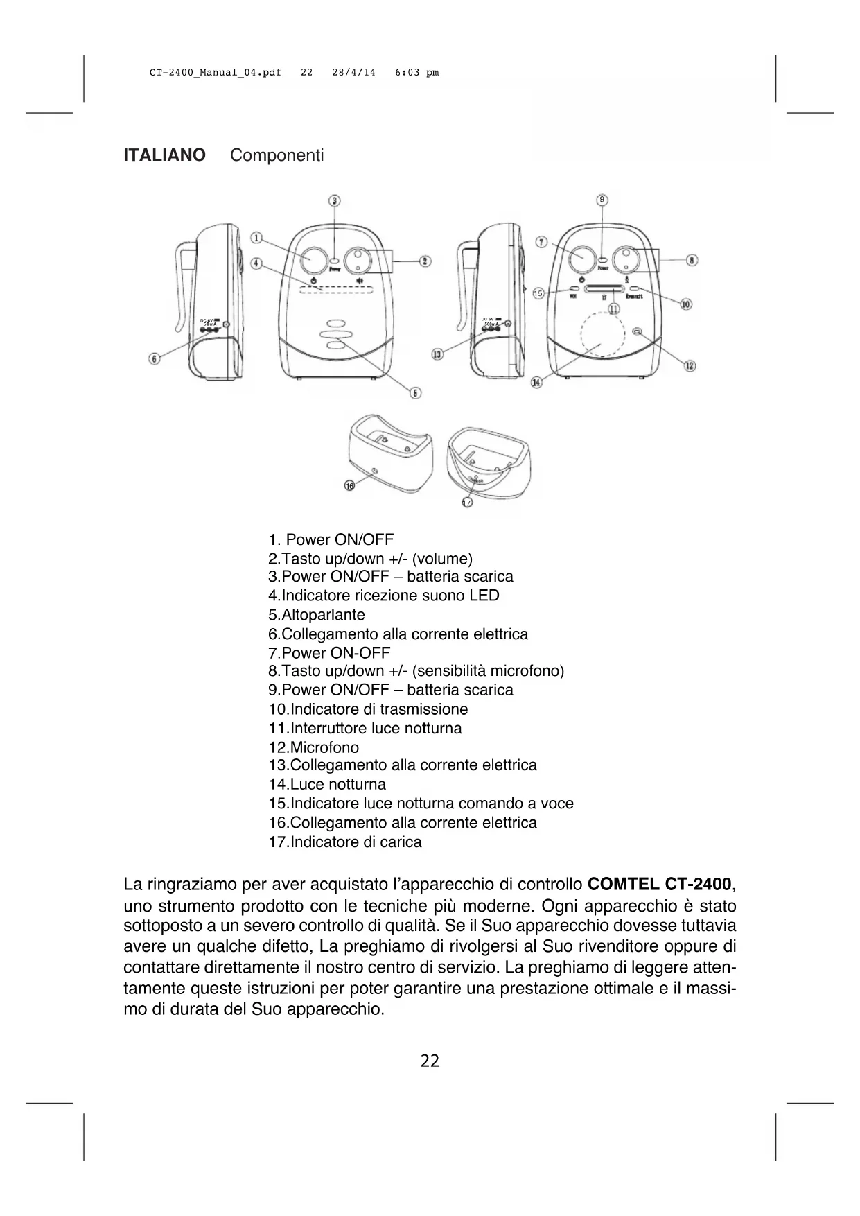 Scarica le istruzioni per il tuo Monitor per bambini in formato PDF gratuitamente! Trova il tuo manuale CT2400 - Comtel e riprendi in mano il tuo dispositivo elettronico. In questa pagina sono pubblicati tutti i documenti necessari per l'utilizzo del tuo dispositivo. CT2400 del marchio Comtel.