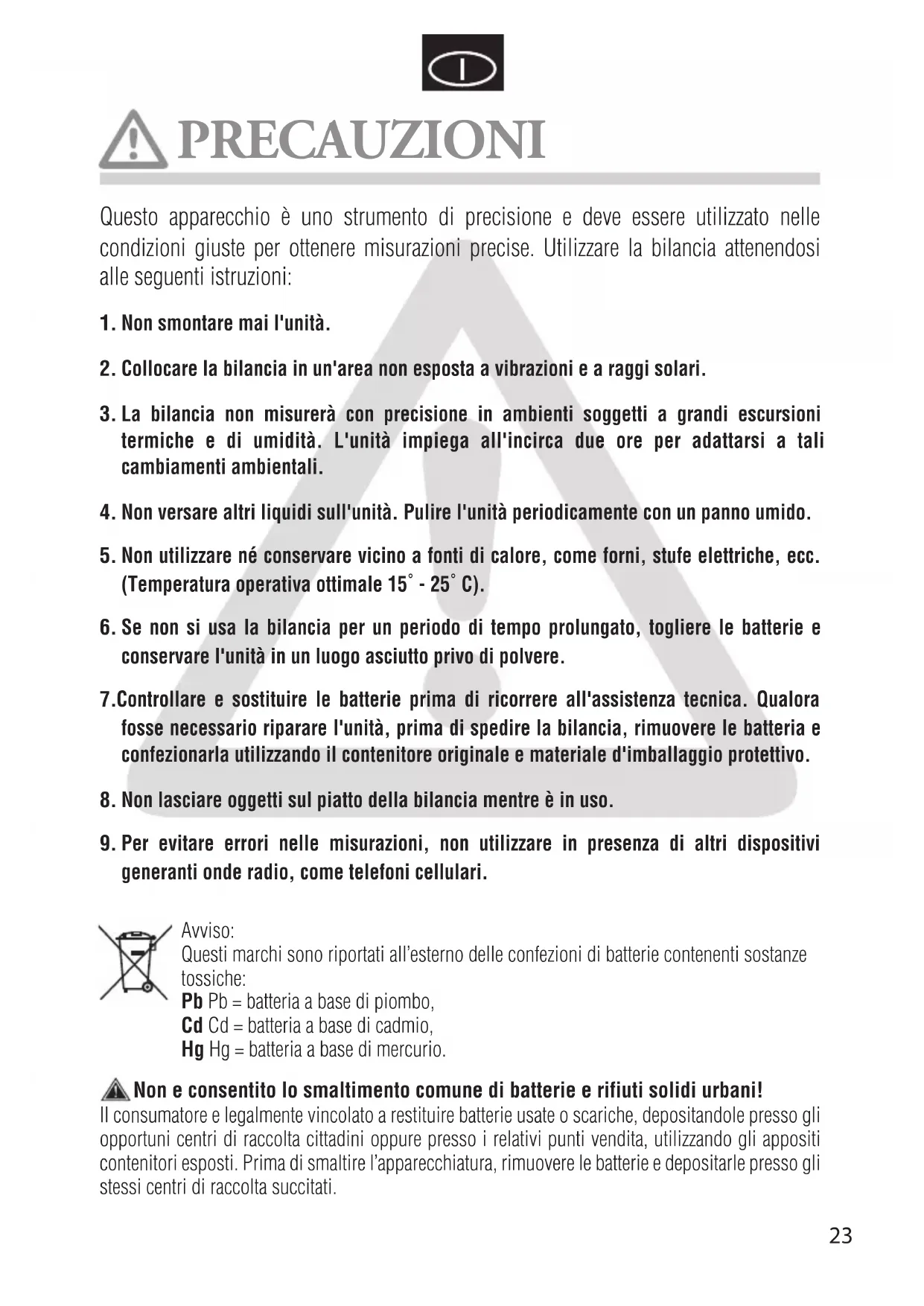 - Non lasciare oggetti sul piatto della bilancia quando è in uso.