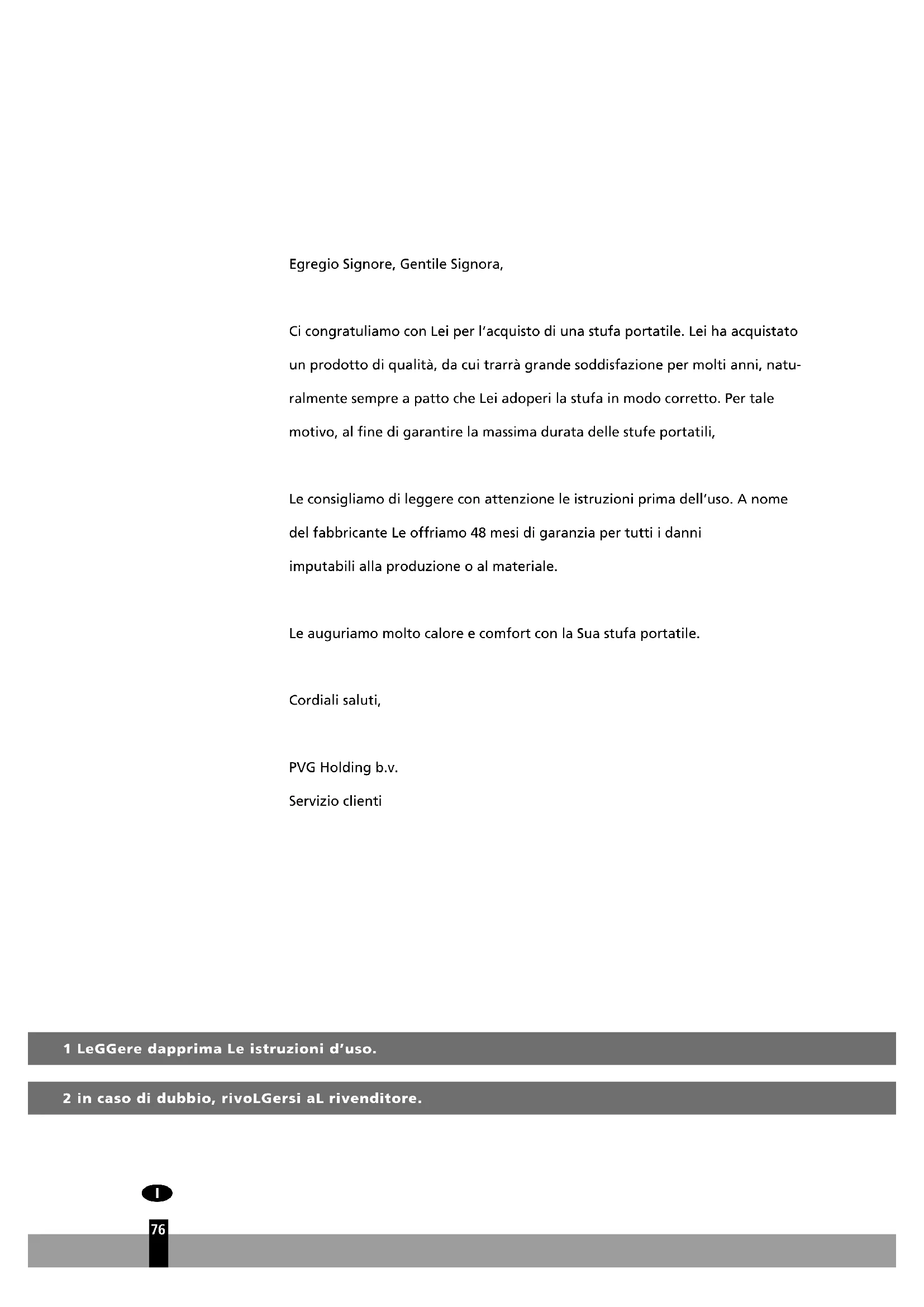 75Egregio Signore, Gentile Signora, Ci congratuliamo con Lei per l’acquisto di una stufa portatile. Lei ha acquistato un prodotto di qualità, da cui trarrà grande soddisfazione per molti anni, natu- ralmente sempre a patto che Lei adoperi la stufa in modo corretto. Per tale motivo, al fine di garantire la massima durata delle stufe portatili, Le consigliamo di leggere con attenzione le istruzioni prima dell’uso. A nome del fabbricante Le offriamo 48 mesi di garanzia per tutti i danni imputabili alla produzione o al materiale. Le auguriamo molto calore e comfort con la Sua stufa portatile. Cordiali saluti, PVG Holding b.v. Servizio clienti 1 LeGGere dapprima Le istruzioni d’uso. 2 in caso di dubbio, rivoLGersi aL rivenditore.