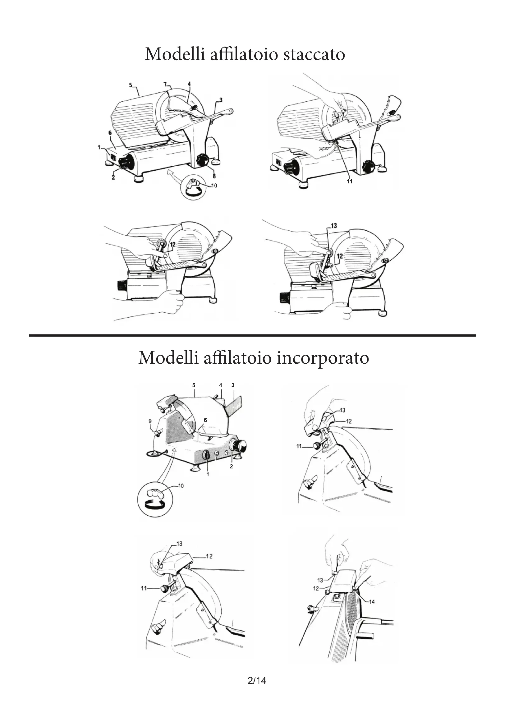 3/144) AFFILATURA LAMA (MODELLI CON AFFILATOIO INCORPORATO) Per l’aflatura della lama da fare periodicamente, e non appena si avvertirà una diminuzione della capacità di taglio, occorre attenersi alle seguenti istruzioni: