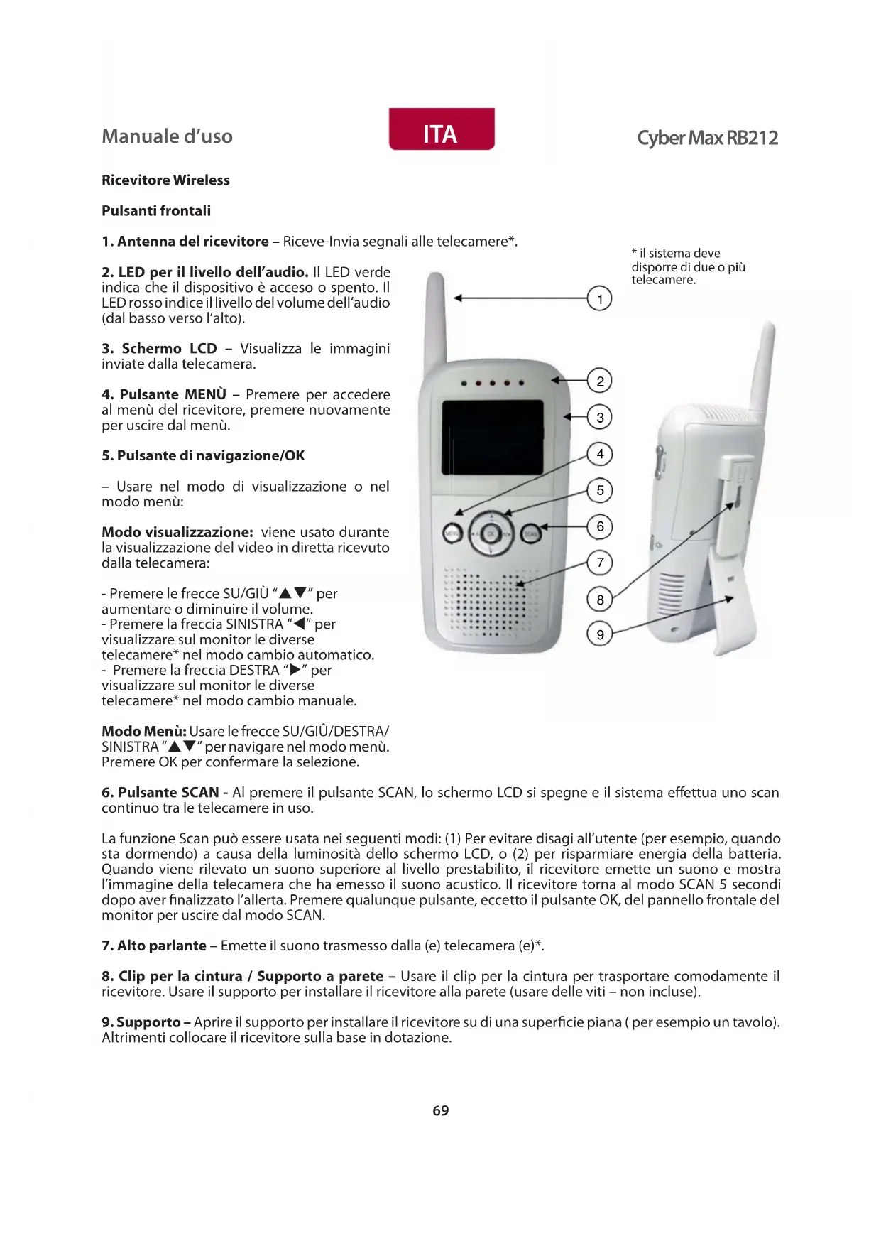 - Pulsante SCAN - Al preme il pulsante SCAN, lo schermo LCD si spegne e ilsystema effettua uno scan continuo tra le telecomere in uso.