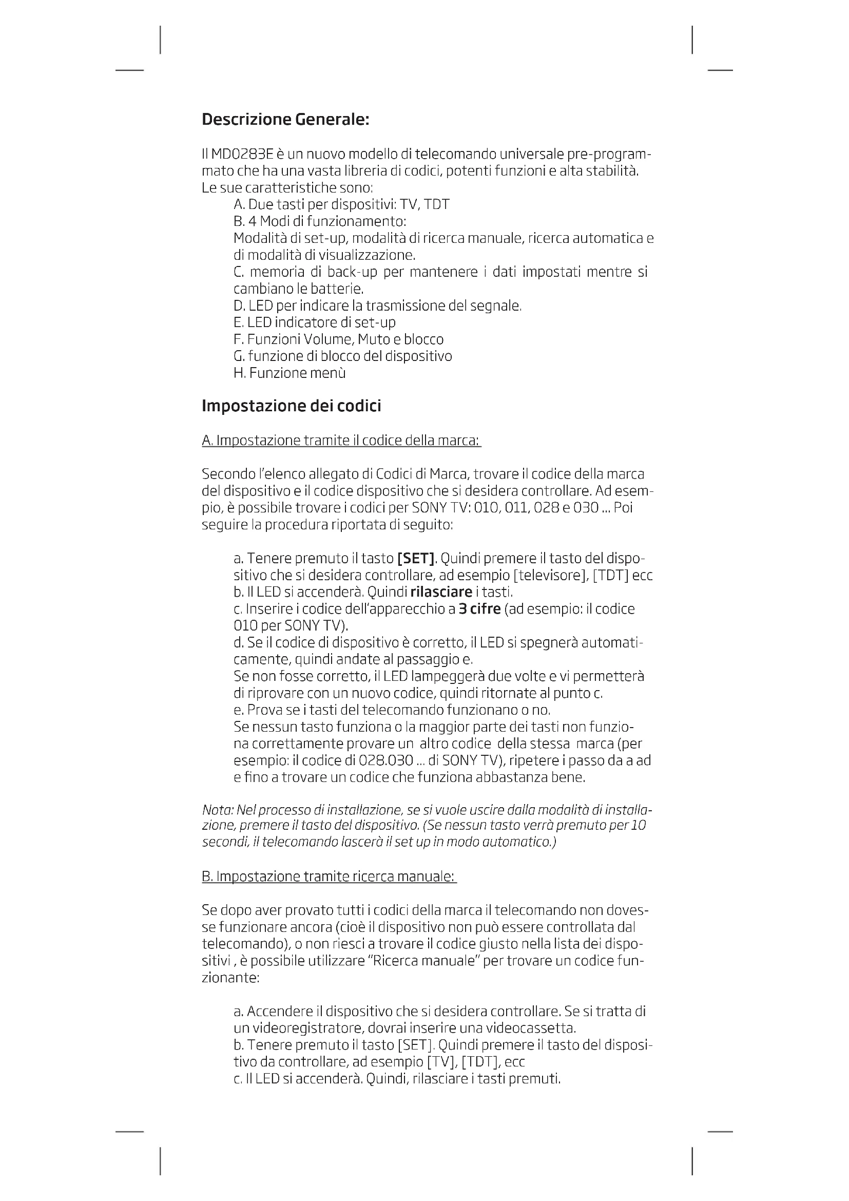 et s’éteindra, votre télécommande sera réinitialisé. Autres Après avoir terminé les réglages, d’abord veuillez appuyer sur la touche périphérique (TV ou TDT) de la télécommande que vous voulez utiliser, et puis utilisez votre télécommande normallement.Descrizione Generale: Il MD0283E è un nuovo modello di telecomando universale pre-program- mato che ha una vasta libreria di codici, potenti funzioni e alta stabilità. Le sue caratteristiche sono: A. Due tasti per dispositivi: TV, TDT B. 4 Modi di funzionamento: Modalità di set-up, modalità di ricerca manuale, ricerca automatica e di modalità di visualizzazione. C. memoria di back-up per mantenere i dati impostati mentre si cambiano le batterie. D. LED per indicare la trasmissione del segnale. E. LED indicatore di set-up F. Funzioni Volume, Muto e blocco G. funzione di blocco del dispositivo H. Funzione menù Impostazione dei codici A. Impostazione tramite il codice della marca: Secondo l’elenco allegato di Codici di Marca, trovare il codice della marca del dispositivo e il codice dispositivo che si desidera controllare. Ad esem- pio, è possibile trovare i codici per SONY TV: 010, 011, 028 e 030 ... Poi seguire la procedura riportata di seguito: a. Tenere premuto il tasto [SET]. Quindi premere il tasto del dispo- sitivo che si desidera controllare, ad esempio [televisore], [TDT] ecc b. Il LED si accenderà. Quindi rilasciare i tasti. c. Inserire i codice dell’apparecchio a 3 cifre (ad esempio: il codice 010 per SONY TV). d. Se il codice di dispositivo è corretto, il LED si spegnerà automati- camente, quindi andate al passaggio e. Se non fosse corretto, il LED lampeggerà due volte e vi permetterà di riprovare con un nuovo codice, quindi ritornate al punto c. e. Prova se i tasti del telecomando funzionano o no. Se nessun tasto funziona o la maggior parte dei tasti non funzio- na correttamente provare un altro codice della stessa marca (per esempio: il codice di 028.030 ... di SONY TV), ripetere i passo da a ad e no a trovare un codice che funziona abbastanza bene. Nota: Nel processo di installazione, se si vuole uscire dalla modalità di installa- zione, premere il tasto del dispositivo. (Se nessun tasto verrà premuto per 10 secondi, il telecomando lascerà il set up in modo automatico.) B. Impostazione tramite ricerca manuale: Se dopo aver provato tutti i codici della marca il telecomando non doves- se funzionare ancora (cioè il dispositivo non può essere controllata dal telecomando), o non riesci a trovare il codice giusto nella lista dei dispo- sitivi , è possibile utilizzare “Ricerca manuale” per trovare un codice fun- zionante: a. Accendere il dispositivo che si desidera controllare. Se si tratta di un videoregistratore, dovrai inserire una videocassetta. b. Tenere premuto il tasto [SET]. Quindi premere il tasto del disposi- tivo da controllare, ad esempio [TV], [TDT], ecc c. Il LED si accenderà. Quindi, rilasciare i tasti premuti.ITA d. Puntare il telecomando verso il dispositivo, premere il tasto [POWER]. Il telecomando entrerà in “Ricerca manuale” e il LED con- tinuerà a lampeggiare. e. Vedere se il dispositivo reagisce o no. Se funziona, andare al pas- saggio f: se no, ripetere dal passo d ogni secondo. f. Prova altre chiavi. Se i tasti funzionano abbastanza bene, premere il tasto di dispositivo per uscire dalla modalità di ricerca. Se la mag- gior parte tasti non funzionano bene, ripetere i passi dal d alla f per trovare il codice migliore. Nota: a. Ogni volta che si vuole lasciare o cambiare modalità di ricerca, premere il tasto di dispositivo per uscire, e il LED si spegne. b. È possibile utilizzare il tasto SET per cambiare la direzione di ricerca. C. Impostazione tramite ricerca automatica: Questa ricerca è simile alla ricerca manuale tranne che trasmette auto- maticamente il invece di trasmetterlo manualmente premendo il tasto di accensione durante la ricerca: a. Accendere il dispositivo che si desidera controllare. b. Tenere premuto [SET], e contemporaneamente, tenere premuto il tasto del dispositivo che si desidera controllare. (Per esempio: TV) per più di 3 secondi e poi rilasciarli, la ricerca automatica avrà inizio. Il telecomando entrata in ricerca automatica, il LED lampeggia, e il telecomando trasmette il segnale di accensione ogni 2,0 secondi automaticamente. c. Vedere se il dispositivo reagisce o no, una volta che il dispositivo reagisce, premere un tasto qualsiasi (tranne il tasto SET) per inte- rrompere la ricerca. d. Verica se altri tasti funzionare abbastanza bene. Se la maggior parte i tasti non funzionano bene, eettuare una nuova ricerca au- tomatica per trovare prossimo codice funzionante e provare no a trovare il codice migliore. Nota: a. Si deve puntare il telecomando verso il dispositivo che si desidera controlla- re durante la ricerca automatica. b. Ogni volta che si vuole lasciare la modalità di ricerca automatica, premere un tasto qualsiasi (tranne il tasto SET) per uscire, il LED si spegnerà e la ricerca sarà nita. c. Quando il telecomando avrà cercato tra tutti i codici disponibili (circa 10 mi- nuti), il telecomando uscirà dal processo di ricerca automatica e si spegnerà. d. In caso non riusciate ad interrompere la ricerca in tempo quando il disposi- tivo reagisce, è possibile utilizzare la ricerca manuale per la ricerca del codice appena trovato. Blocco / Sblocco dei Tasti Volume e Muto a. Premere il tasto del dispositivo di cui vuoi impostare i tasti volume e muto ad esempio [TV], [TDT], ecc b. Tenere premuto il tasto [SET], quindi premere il tasto [5], quindi rilasciare entrambi i tasti premuti, il LED lampeggia due volte poi si spegne, i tasti volume e muto del dispositivo corrente sono bloccati. c. Se si vuole sbloccare il tasto volume e muto, tenere premuto il tas- to [SET], quindi premere il tasto [6], quindi rilasciare i tasti premuti, il LED lampeggia due volte e poi si spegnerà,i tasti volume e muto sono sbloccati.Blocco / Sblocco d