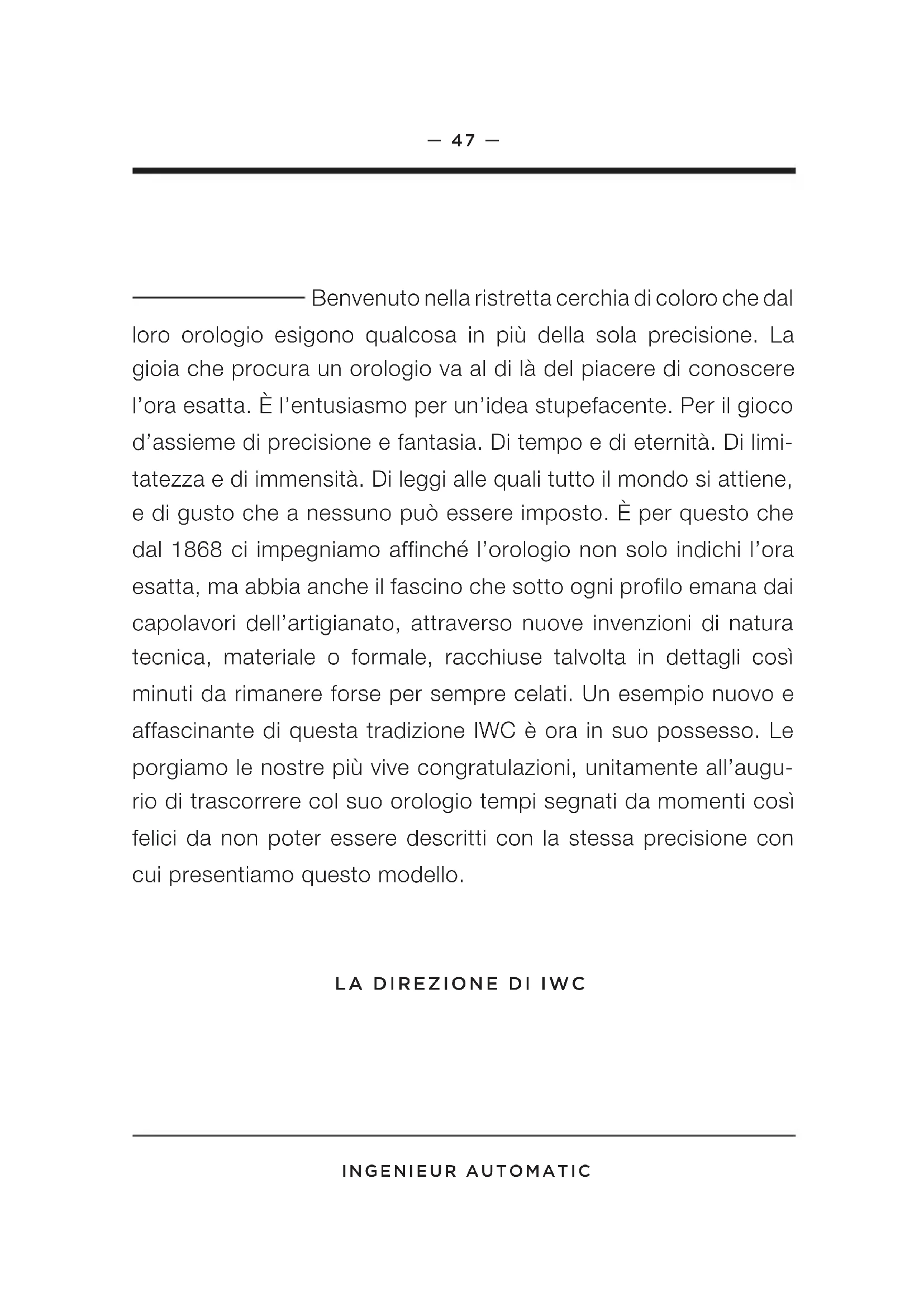 1— 50 — ingenieur autOMatic le FunziOni della cOrOna X — Posizione normale (avvitata) 0 — Posizione di carica 1 — Regolazione della data 2 — Regolazione dell’ora la pOsiziOne nOrMale Quest’orologio dispone di una corona a vite. La posizione avvitata (posizione normale, X) evita l’accidentale spostamento dell’ora o della data e assicura alla cassa dell’orologio un’ulteriore protezio- ne contro le infiltrazioni d’acqua. Per sbloccare la corona, svitarla ruotandola verso sinistra; in questo modo la si porterà automa- ticamente in posizione 0, la posizione di carica. Premendola in posizione X e ruotandola contemporaneamente verso destra, la corona si avviterà e si bloccherà nuovamente. X 0 1 2— 51 — ingenieur autOMatic la pOsiziOne di carica Nella posizione di carica (0) può caricare il movimento automati- co anche manualmente. Per avviare il movimento sono sufficienti poche rotazioni della corona. Tuttavia, è consigliabile caricare l’orologio con circa 20 rotazioni della corona per conferirgli la massima precisione di marcia. la regOlaziOne della data Per i mesi che hanno meno di 31 giorni, deve regolare manu- almente la data facendola avanzare al primo giorno del mese successivo. Estragga la corona a vite portandola in posizione1 e la ruoti verso sinistra in modo da cambiare la data (regolazio- ne diretta). Eviti di effettuare la correzione rapida nell’intervallo compreso tra le ore 20 e le ore 2, perché in questo periodo il movimento fa scattare automaticamente la nuova data.— 52 — ingenieur autOMatic la regOlaziOne dell’Ora Estragga la corona portandola in posizione 2. In questo modo bloccherà il movimento. Per una regolazione precisa al secondo è consigliabile bloccare il movimento quando la lancetta dei secon- di si trova su 60. Faccia avanzare la lancetta dei minuti di qualche indice oltre l’orario da impostare e quindi la riporti delicatamente indietro esattamente sul trattino che indica i minuti. Questo pro- cedimento assicura l’immediato avvio della lancetta dei minuti al momento dell’azionamento del movimento. Per far partire la lan- cetta dei secondi, prema sulla corona riportandola in posizione 0. Nella regolazione dell’ora faccia attenzione allo scatto della data, che avviene sempre a mezzanotte (ore 24). Se la data cambia già a mezzogiorno, deve far avanzare le lancette di 12 ore. Importante: nelle posizioni 0, 1 e 2, l’orologio è impermeabile; tuttavia, per il normale impiego, la corona deve essere sempre riavvitata (posizione X).— 53 — ingenieur autOMatic la lettura dell’Ora al BuiO Il quadrante nonché la lancetta delle ore e quella dei minuti del suo orologio sono muniti di elementi luminescenti che consen- tono di leggere perfettamente l’ora anche in piena oscurità. L’elemento luminescente in corrispondenza delle ore 12 serve da orientamento. l’adattaMentO e la regOlaziOne del Bracciale MetallicO Il bracciale metallico è realizzato in modo da poter essere adatta- to senza problemi alle dimensioni del suo polso. Può effettuare da sé questo adattamento, aggiungendo o togliendo singole maglie.— 54 — ingenieur autOMatic la separaziOne del Bracciale Apra la fibbia déployante facendo pres- sione sui tasti laterali. Distenda il braccia- le con il lato superiore appoggiato su un supporto rigido. Per evitare di graffiare il bracciale e la superficie di appoggio, inter- ponga un panno. Con l’apposito utensile in dotazione può ora spingere in basso il perno di fissaggio nel punto di giunzione desiderato (1) spingen- do contemporaneamente il perno di snodo verso l’esterno (circa 3 millimetri) con il secondo utensile (2). Estragga ora il perno di snodo sporgen- te dal bracciale (3). Adesso il bracciale è separato.— 55 — ingenieur autOMatic la deterMinaziOne delle Maglie da estrarre Indossi l’orologio al polso con la fibbia déployante chiusa e calcoli, in base alla sovrapposizione, il numero di maglie in eccesso, che ora potrà togliere come descritto di seguito: se è necessario estrarre dal bracciale diverse maglie, faccia in modo di togliere da entrambi i lati del bracciale un numero di maglie possibilmente uguale, affinché la chiusura ven- ga a trovarsi sempre verso la metà del polso.— 56 — ingenieur autOMatic l’estraziOne di singOle Maglie e la ricOngiunziOne del Bracciale Ripeta le operazioni da 1 a 3 alla distanza precedentemente stabilita dal primo punto di giunzione. Estragga le maglie staccate e ricongiunga il bracciale accorciato. Inserisca il perno di snodo lateralmente nel punto di giunzione (1). Ora con l’utensile allegato spinga in dentro il perno di fissaggio (2) e completi contempo- raneamente l’inserimento nel bracciale del perno di snodo riportandolo a livello (3). Il perno di fissaggio deve essere reinserito a fondo, a livello del bordo superiore della maglia di ritenuta. Al termine, controlli che la posizione dei perni di fissaggio sia corretta. Custodisca con cura le maglie in eccesso e l’apposito utensile per la separazione del bracciale. Potranno servirle in futuro per eventuali ulteriori adattamenti.— 57 — ingenieur autOMatic l’iMperMeaBilità I dati sull’impermeabilità degli orologi IWC sono indicati in bar e non in metri. Sebbene sia spesso utilizzata nell’industria orologie- ra, l’indicazione in metri può infatti non coincidere con la profon- dità d’immersione reale a causa dei metodi di collaudo adottati. L’indicazione in metri non offre quindi un’informazione assoluta- mente attendibile sulle effettive possibilità di utilizzo in ambienti umidi e nell’impiego in acqua o sott’acqua. Per questioni relative all’impermeabilità del suo orologio può consultare il nostro sito www.iwc.com/water-resistance oppure rivolgersi al rivenditore IWC autorizzato (Official Agent) che sarà lieto di fornirle maggiori informazioni. Per garantire la perfetta funzionalità del suo orologio, le racco- mandiamo di farlo controllare almeno una vo