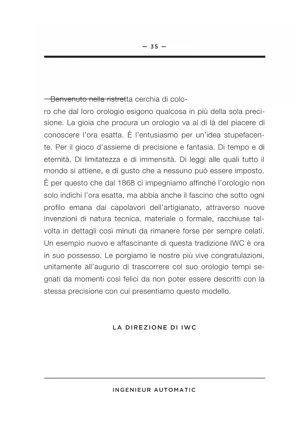 élevé inFOrMatiOns cOMpléMentaires sur WWW.iWc.cOM/case-Materials ingenieur autOMatic— 35 — ingenieur autOMatic Benvenuto nella ristretta cerchia di colo- ro che dal loro orologio esigono qualcosa in più della sola preci- sione. La gioia che procura un orologio va al di là del piacere di conoscere l’ora esatta. È l’entusiasmo per un’idea stupefacen- te. Per il gioco d’assieme di precisione e fantasia. Di tempo e di eternità. Di limitatezza e di immensità. Di leggi alle quali tutto il mondo si attiene, e di gusto che a nessuno può essere imposto. È per questo che dal 1868 ci impegniamo affinché l’orologio non solo indichi l’ora esatta, ma abbia anche il fascino che sotto ogni profilo emana dai capolavori dell’artigianato, attraverso nuove invenzioni di natura tecnica, materiale o formale, racchiuse tal- volta in dettagli così minuti da rimanere forse per sempre celati. Un esempio nuovo e affascinante di questa tradizione IWC è ora in suo possesso. Le porgiamo le nostre più vive congratulazioni, unitamente all’augurio di trascorrere col suo orologio tempi se- gnati da momenti così felici da non poter essere descritti con la stessa precisione con cui presentiamo questo modello. la direziOne di iWc— 36 — ingenieur autOMatic le Finezze tecniche dell’ingenieur autOMatic Il suo orologio IWC le indica l’ora in ore, minuti e secondi non- ché la data. L’orologio è impermeabile 12 bar e protetto da un vetro zaffiro del grado di durezza 9 secondo la scala di Mohs. Il movimento meccanico con carica automatica dispone, a cari- ca completa, di un’autonomia di marcia di circa 44 ore. Il rotore carica l’orologio in entrambi i sensi di rotazione tramite il sistema di ricarica Pellaton. Affinché questo straordinario orologio possa sempre svolgere al meglio le sue funzioni, le consigliamo di segui- re attentamente le poche ma importanti istruzioni d’uso riportate qui di seguito.— 37 — ingenieur autOMatic 1 Lancetta delle ore 2 Lancetta dei minuti 3 Lancetta dei secondi Datario