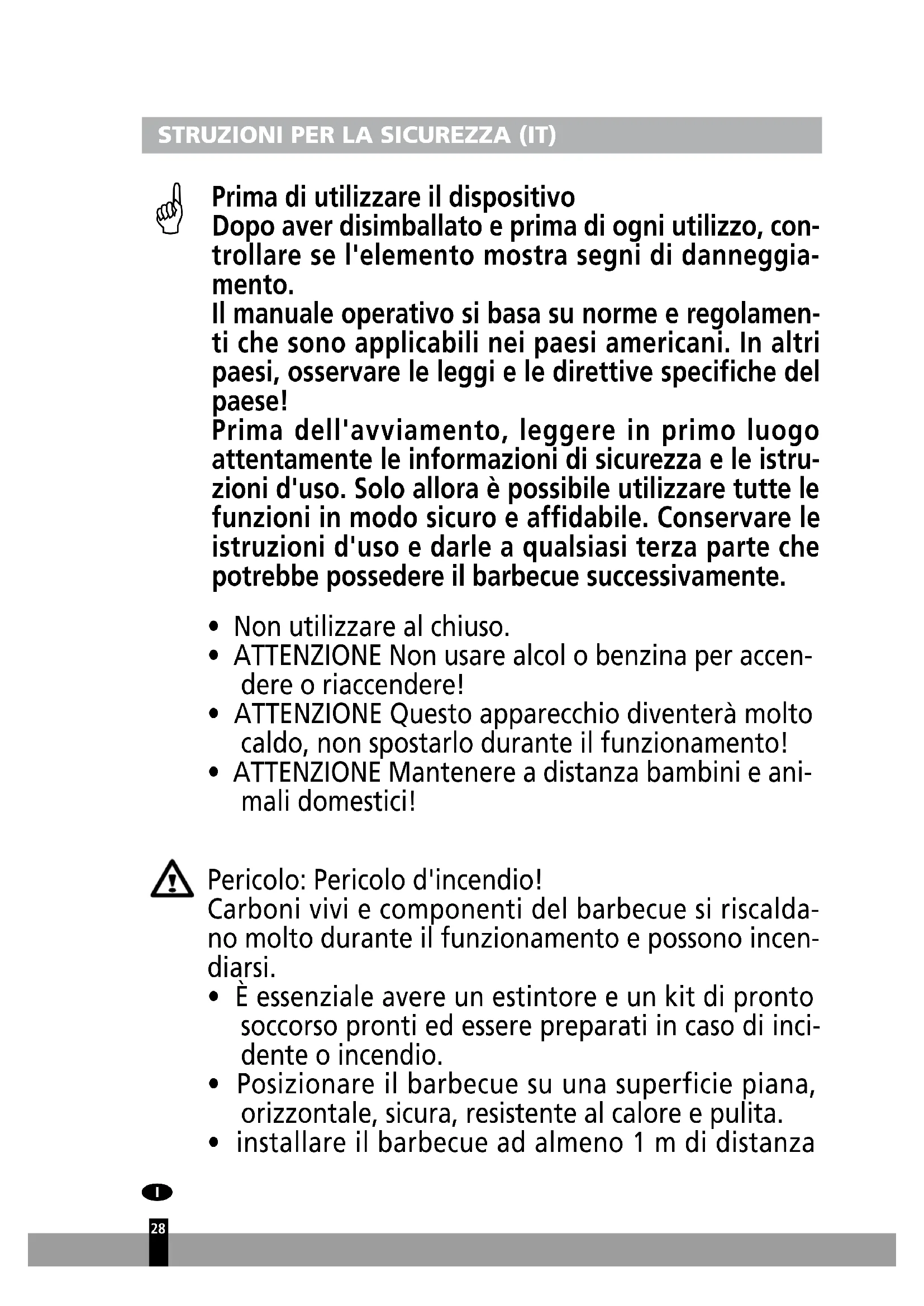 Prima di utilizzare il dispositivo Dopo aver disimballato e prima di ogni utilizzo, con- trollare se l'elemento mostra segni di danneggia- mento. Il manuale operativo si basa su norme e regolamen- ti che sono applicabili nei paesi americani. In altri paesi, osservare le leggi e le direttive specifiche del paese! Prima dell'avviamento, leggere in primo luogo attentamente le informazioni di sicurezza e le istru- zioni d'uso. Solo allora è possibile utilizzare tutte le funzioni in modo sicuro e affidabile. Conservare le istruzioni d'uso e darle a qualsiasi terza parte che potrebbe possedere il barbecue successivamente.