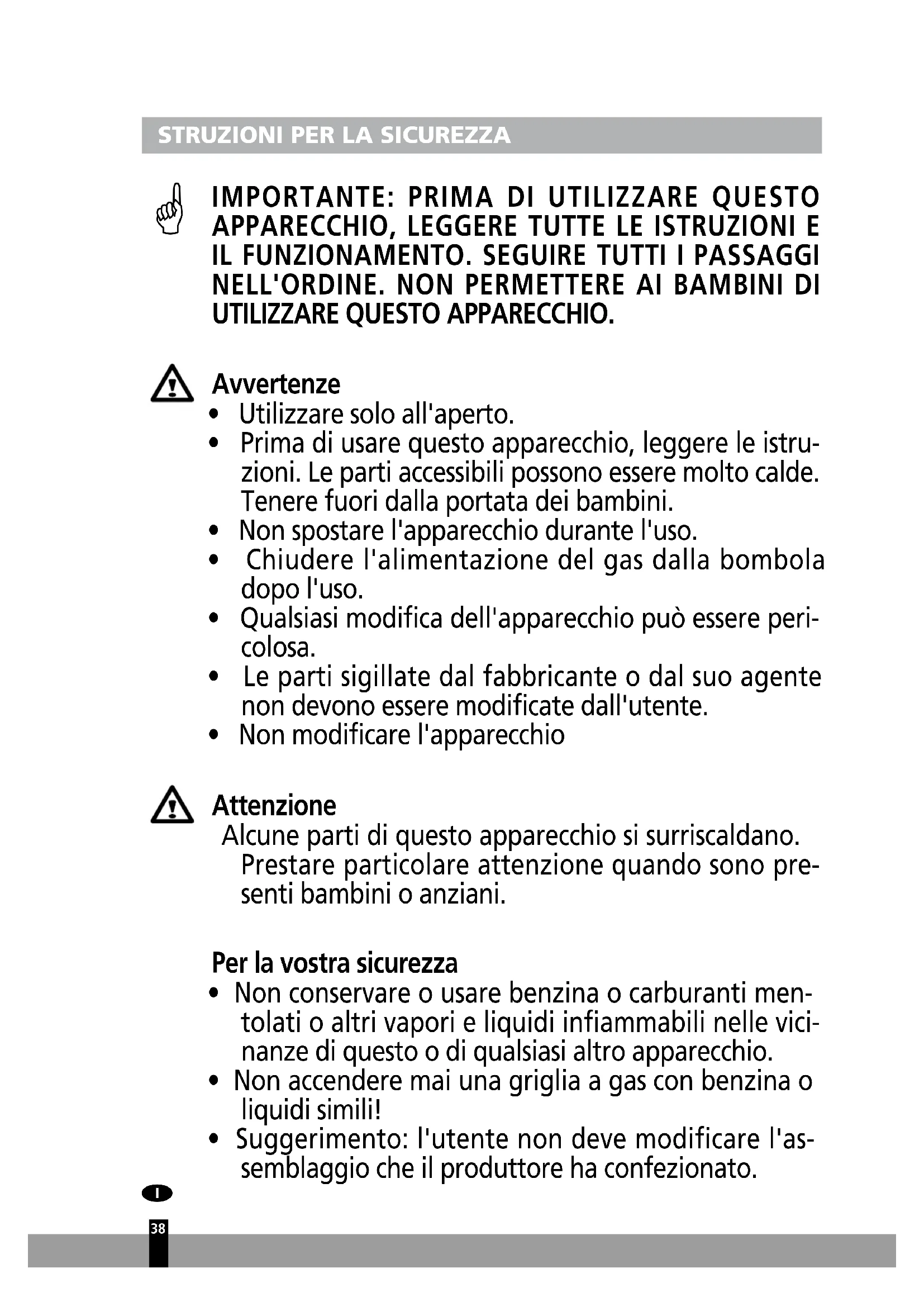 - Non accendere mai una griglia a gas con benzina o liquidi simili!