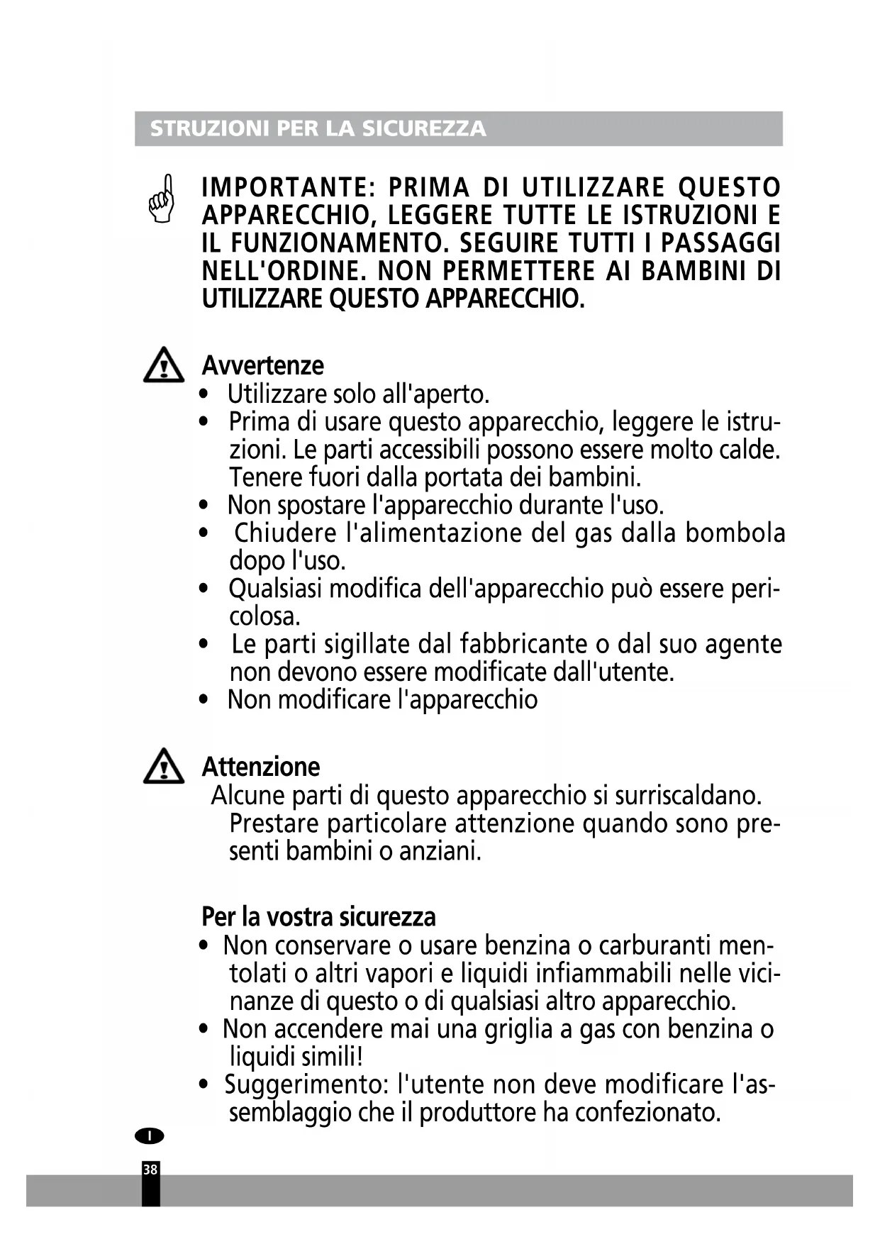 - Tenere bambini e animali domestici a distanza di sicurezza dalla griglia a gas.